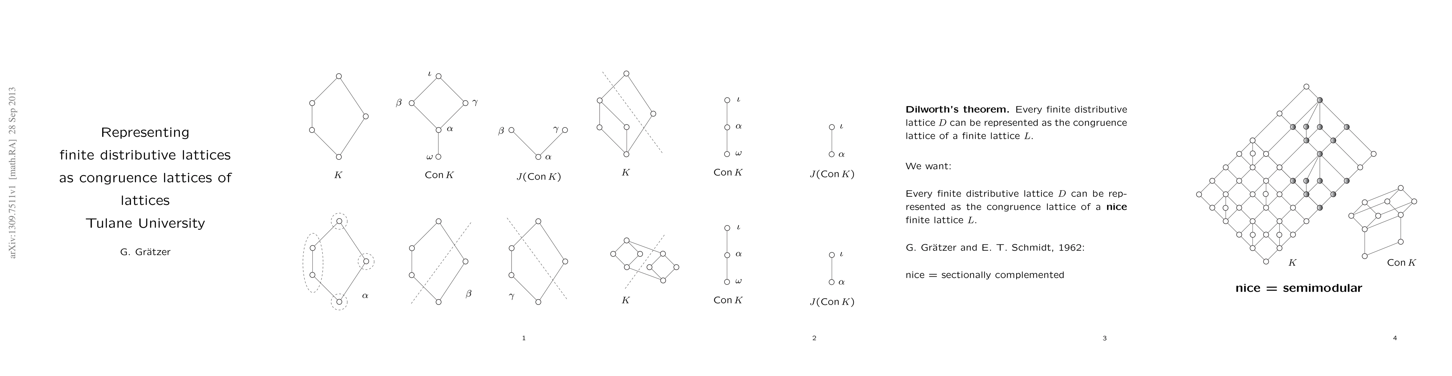 Dilworth's theorem. Every finite distributive lattice $D$ can be represented as the congruence lattice of a finite lattice $L$. We want: Every finite distributive lattice $D$ can be represented as the congruence lattice of a nice finite lattice $L$. nice = sectionally complemented, uniform, semimodular, given automorphism group, regular, uniform, isoform