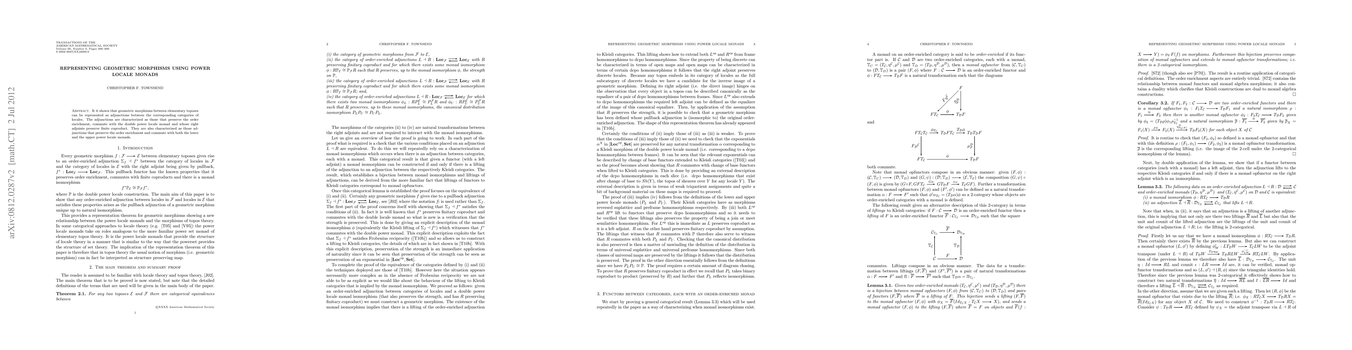 This paper demonstrates that geometric morphisms between toposes can be represented as adjunctions between locale categories, characterized by their preservation of order enrichment and compatibility with power locale monads, specifically the double, upper, and lower power locale monads.