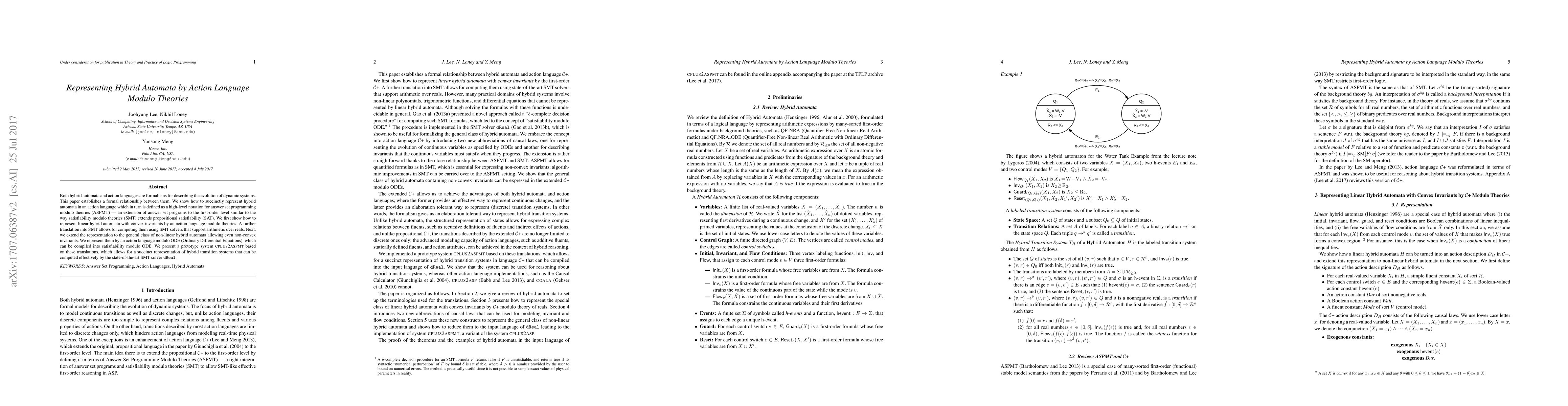 This paper establishes a formal translation between hybrid automata and action languages defined in answer set programming modulo theories (ASPMT). It shows how linear and non-linear hybrid automata can be represented succinctly in an action language, facilitating their computation using state-of-the-art SMT solvers like dReal.