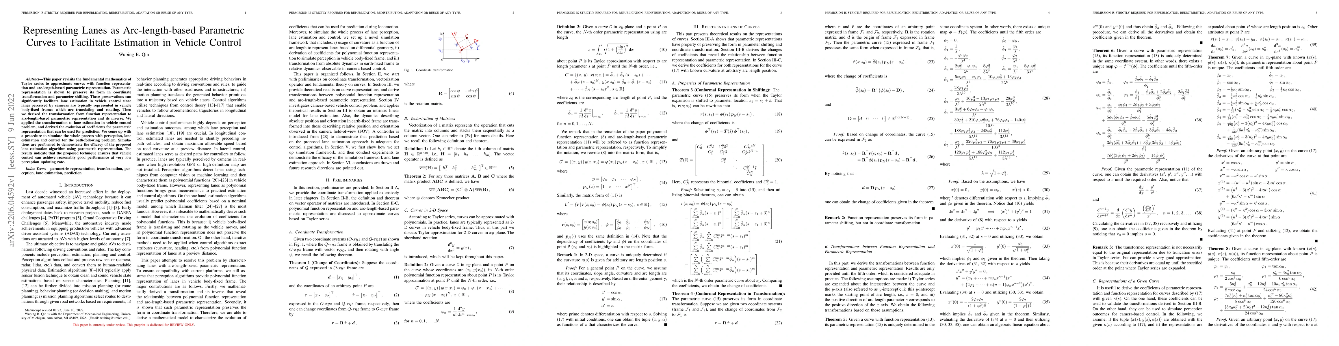 This paper proposes using arc-length-based parametric curves to improve lane estimation in vehicle control. It demonstrates the benefits of parametric representations over function representations in dynamic environments, and shows how these representations facilitate transformation and prediction for lane estimation.