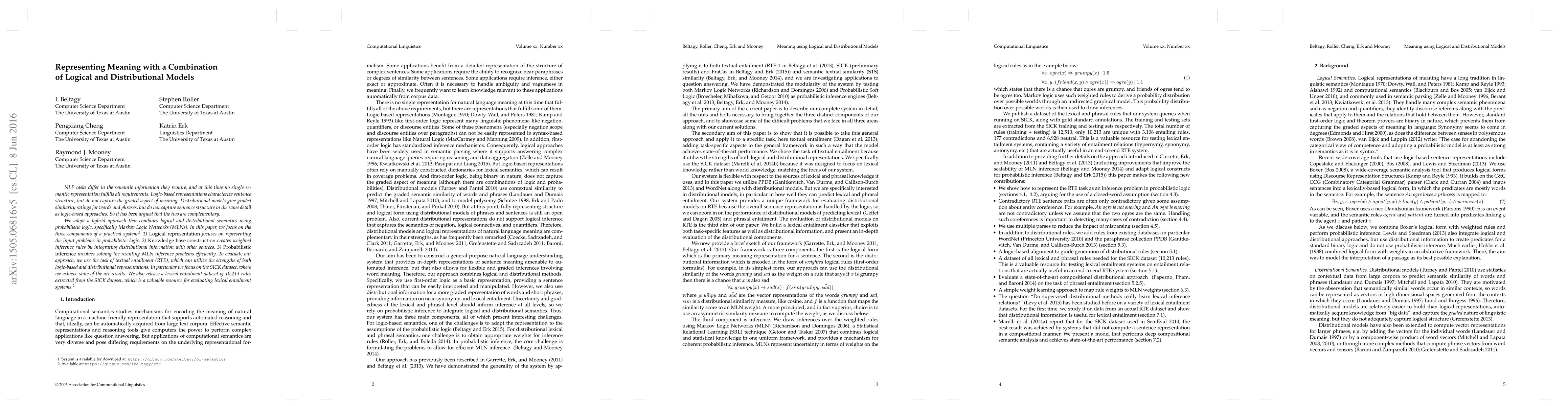 This paper proposes a hybrid approach combining logic-based and distributional semantics using Markov Logic Networks to address diverse NLP tasks. It integrates parsing and task representation in probabilistic logic, constructs knowledge bases with weighted inference rules, and efficiently solves inference problems, achieving state-of-the-art results on the SICK textual entailment dataset.
