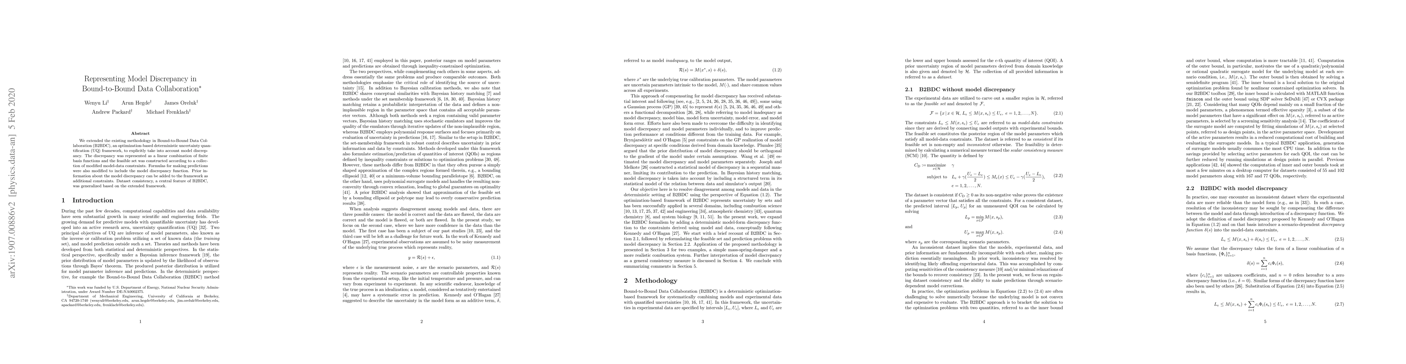 We extended the existing methodology in Bound-to-Bound Data Collaboration (B2BDC), an optimization-based deterministic uncertainty quantification (UQ) framework, to explicitly take into account model discrepancy. The discrepancy was represented as a linear combination of finite basis functions and the feasible set was constructed according to a collection of modified model-data constraints. Formulas for making predictions were also modified to include the model discrepancy function. Prior information about the model discrepancy can be added to the framework as additional constraints. Dataset consistency, a central feature of B2BDC, was generalized based on the extended framework.