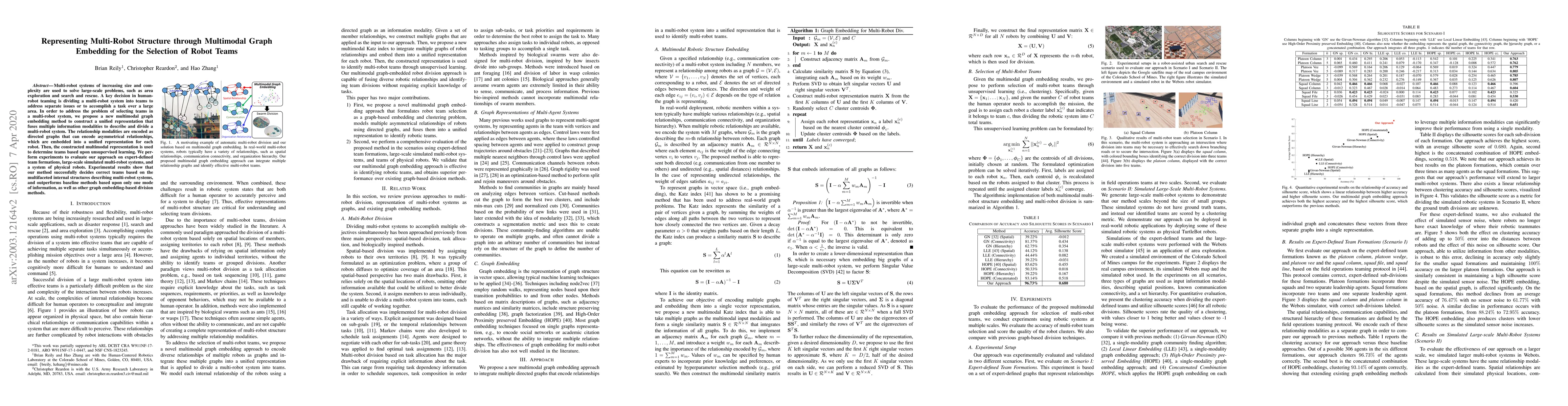 This paper proposes a multimodal graph embedding method to represent multi-robot systems, integrating various information modalities to form a unified representation for team selection. The method outperforms baselines by effectively determining robot teams based on complex internal structures and relationships.