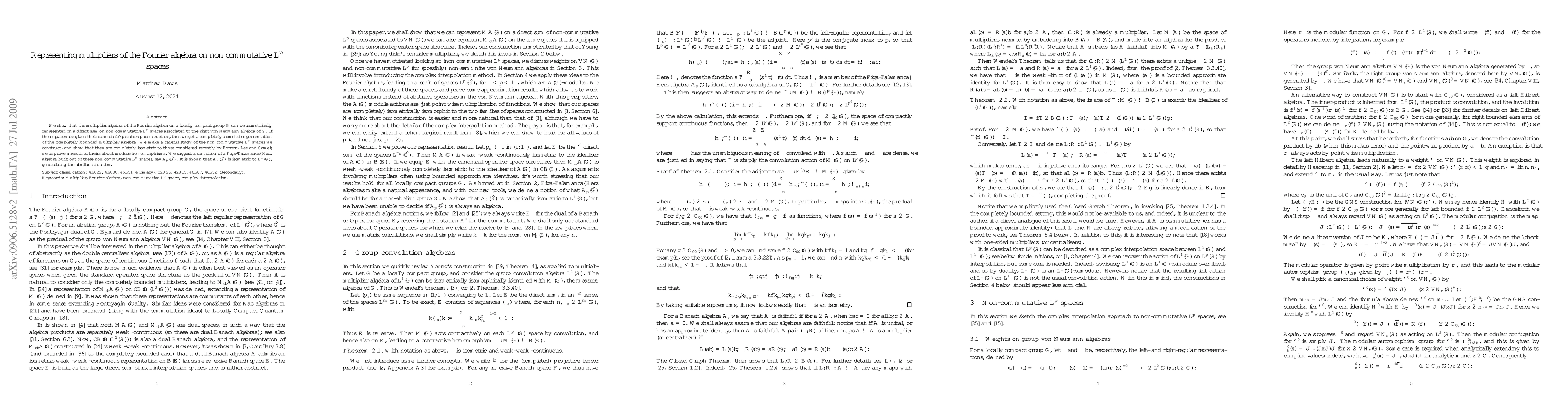 We show that the multiplier algebra of the Fourier algebra on a locally compact group $G$ can be isometrically represented on a direct sum on non-commutative $L^p$ spaces associated to the right von Neumann algebra of $G$. If these spaces are given their canonical Operator space structure, then we get a completely isometric representation of the completely bounded multiplier algebra. We make a careful study of the non-commutative $L^p$ spaces we construct, and show that they are completely isometric to those considered recently by Forrest, Lee and Samei; we improve a result about module homomorphisms. We suggest a definition of a Figa-Talamanca--Herz algebra built out of these non-commutative $L^p$ spaces, say $A_p(\hat G)$. It is shown that $A_2(\hat G)$ is isometric to $L^1(G)$, generalising the abelian situation.
