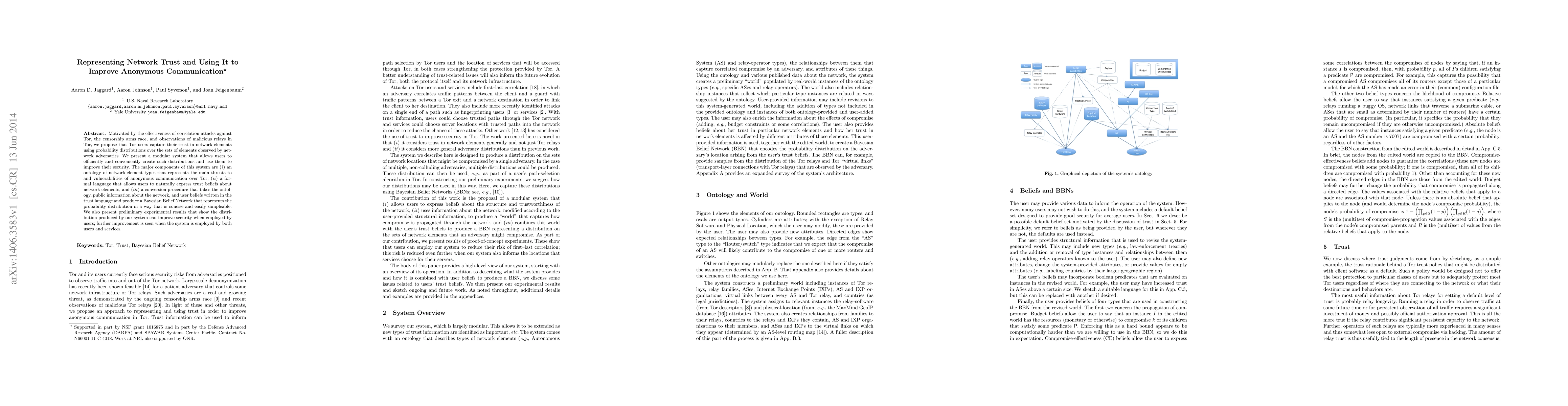 Motivated by the effectiveness of correlation attacks against Tor, the censorship arms race, and observations of malicious relays in Tor, we propose that Tor users capture their trust in network elements using probability distributions over the sets of elements observed by network adversaries. We present a modular system that allows users to efficiently and conveniently create such distributions and use them to improve their security. The major components of this system are (i) an ontology of network-element types that represents the main threats to and vulnerabilities of anonymous communication over Tor, (ii) a formal language that allows users to naturally express trust beliefs about network elements, and (iii) a conversion procedure that takes the ontology, public information about the network, and user beliefs written in the trust language and produce a Bayesian Belief Network that represents the probability distribution in a way that is concise and easily sampleable. We also present preliminary experimental results that show the distribution produced by our system can improve security when employed by users; further improvement is seen when the system is employed by both users and services.