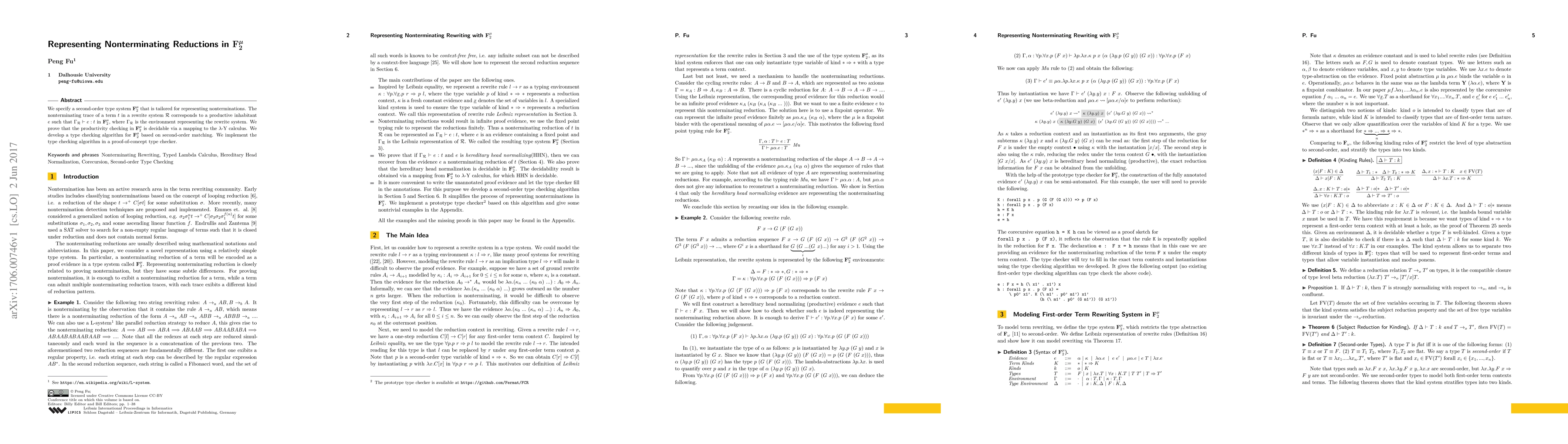 We specify a second-order type system $\mathbf{F}_2^\mu$ that is tailored for representing nonterminations. The nonterminating trace of a term $t$ in a rewrite system $\mathcal{R}$ corresponds to a productive inhabitant $e$ such that $\Gamma_{\mathcal{R}} \vdash e : t$ in $\mathbf{F}_2^\mu$, where $\Gamma_{\mathcal{R}}$ is the environment representing the rewrite system. We prove that the productivity checking in $\mathbf{F}_2^\mu$ is decidable via a mapping to the $\lambda$-Y calculus. We develop a type checking algorithm for $\mathbf{F}_2^\mu$ based on second-order matching. We implement the type checking algorithm in a proof-of-concept type checker.