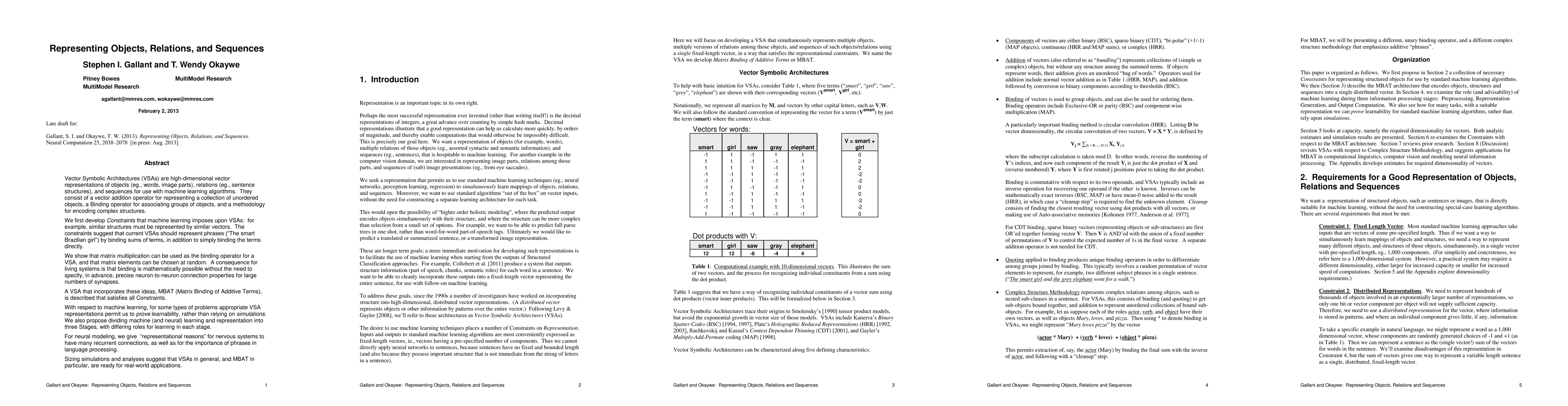 Vector Symbolic Architectures (VSAs) are high-dimensional vector representations of objects (eg., words, image parts), relations (eg., sentence structures), and sequences for use with machine learning algorithms. They consist of a vector addition operator for representing a collection of unordered objects, a Binding operator for associating groups of objects, and a methodology for encoding complex structures. We first develop Constraints that machine learning imposes upon VSAs: for example, similar structures must be represented by similar vectors. The constraints suggest that current VSAs should represent phrases ("The smart Brazilian girl") by binding sums of terms, in addition to simply binding the terms directly. We show that matrix multiplication can be used as the binding operator for a VSA, and that matrix elements can be chosen at random. A consequence for living systems is that binding is mathematically possible without the need to specify, in advance, precise neuron-to-neuron connection properties for large numbers of synapses. A VSA that incorporates these ideas, MBAT (Matrix Binding of Additive Terms), is described that satisfies all Constraints. With respect to machine learning, for some types of problems appropriate VSA representations permit us to prove learnability, rather than relying on simulations. We also propose dividing machine (and neural) learning and representation into three Stages, with differing roles for learning in each stage. For neural modeling, we give "representational reasons" for nervous systems to have many recurrent connections, as well as for the importance of phrases in language processing. Sizing simulations and analyses suggest that VSAs in general, and MBAT in particular, are ready for real-world applications.