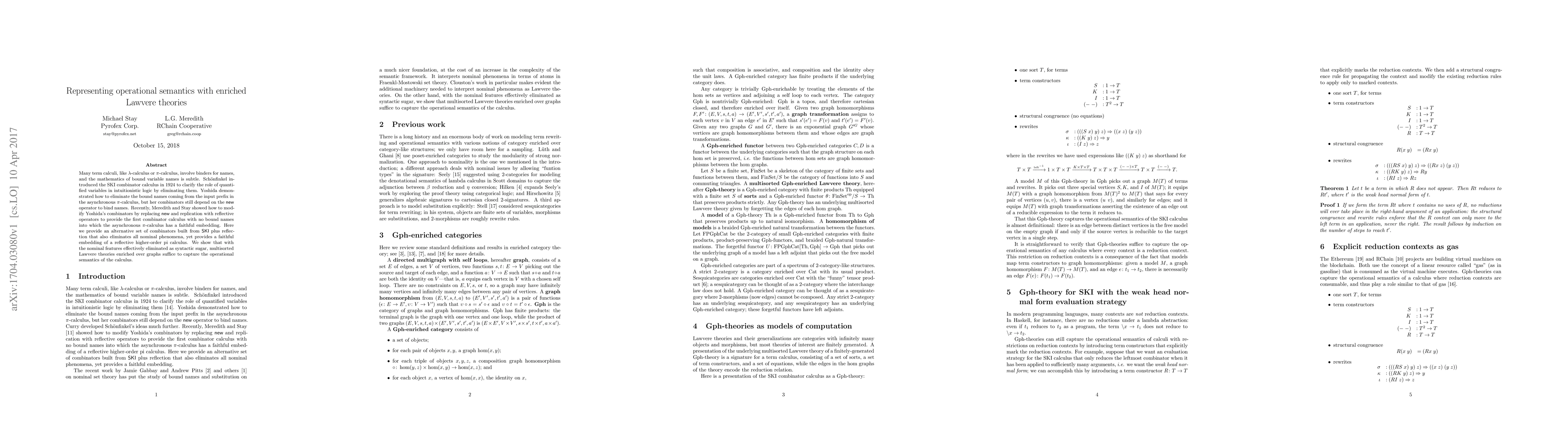 Many term calculi, like lambda calculus or pi calculus, involve binders for names, and the mathematics of bound variable names is subtle. Schoenfinkel introduced the SKI combinator calculus in 1924 to clarify the role of quantified variables in intuitionistic logic by eliminating them. Yoshida demonstrated how to eliminate the bound names coming from the input prefix in the asynchronous pi calculus, but her combinators still depend on the new operator to bind names. Recently, Meredith and Stay showed how to modify Yoshida's combinators by replacing new and replication with reflective operators to provide the first combinator calculus with no bound names into which the asynchronous pi calculus has a faithful embedding. Here we provide an alternative set of combinators built from SKI plus reflection that also eliminates all nominal phenomena, yet provides a faithful embedding of a reflective higher-order pi calculus. We show that with the nominal features effectively eliminated as syntactic sugar, multisorted Lawvere theories enriched over graphs suffice to capture the operational semantics of the calculus.