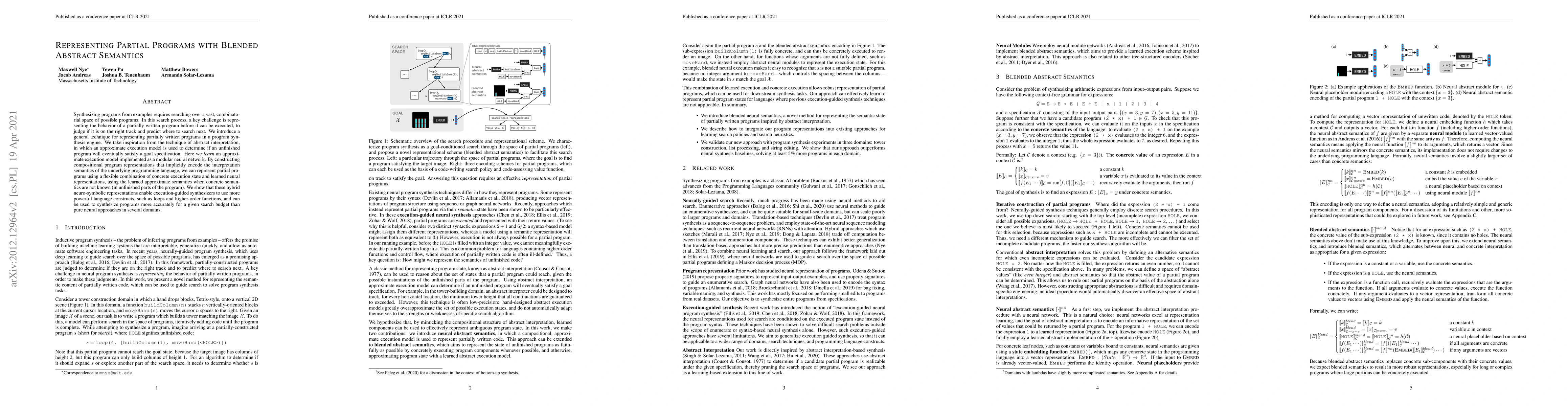This paper introduces a technique for representing partially written programs using blended abstract semantics, combining neural networks with modular neural models to approximate execution behavior. This hybrid approach enables program synthesizers to utilize complex constructs and synthesize programs more accurately than pure neural methods.
