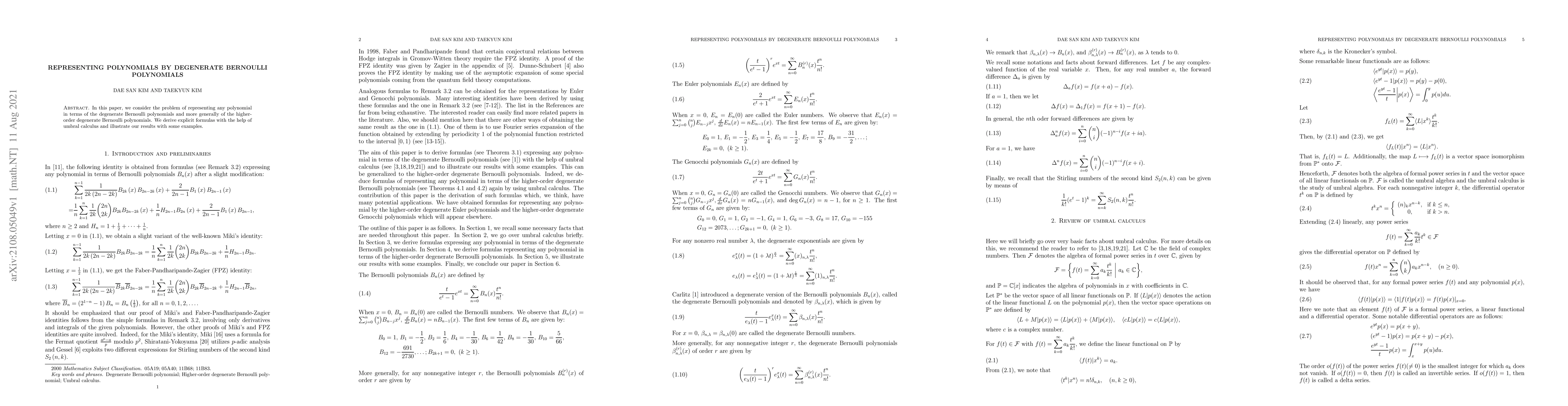 In this paper, we consider the problem of representing any polynomial in terms of the degenerate Bernoulli polynomials and more generally of the higher-order degenerate Bernoulli polynomials. We derive explicit formulas with the help of umbral calculus and illustrate our results with some examples.