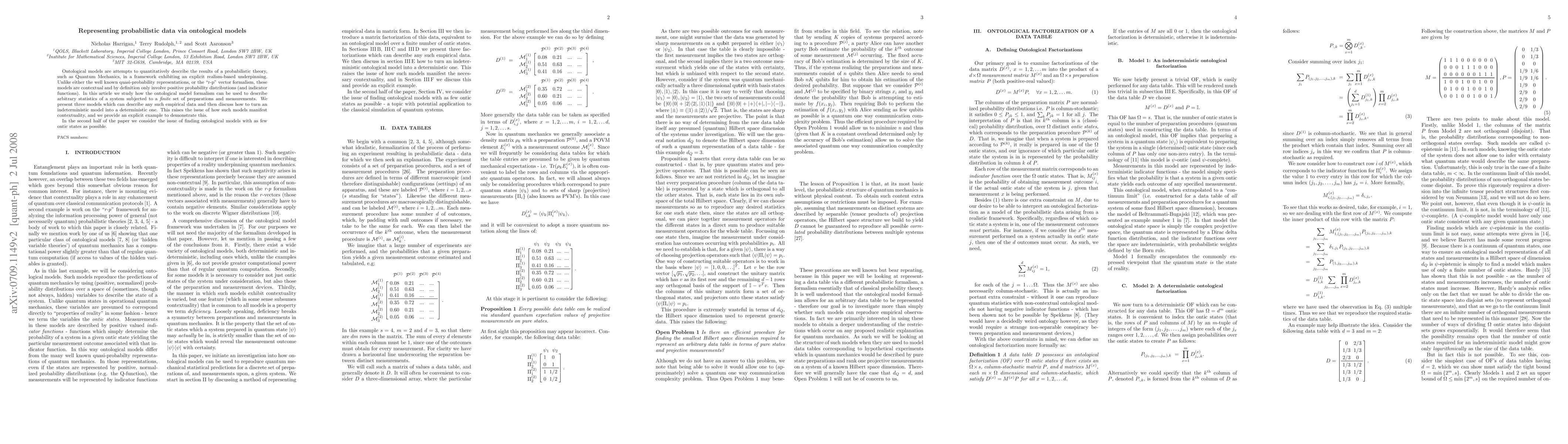This paper introduces ontological models for representing probabilistic data, providing a new framework for describing arbitrary statistics in quantum systems. It also explores the issue of minimizing the number of underlying states in these models to manifest contextuality.