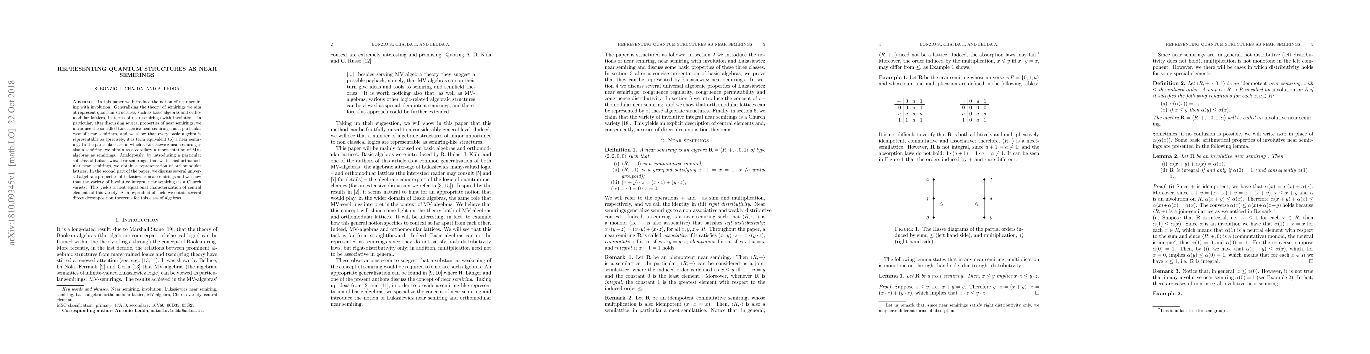 This paper proposes the concept of near semirings with involution to represent quantum structures like basic algebras and orthomodular lattices. It shows that basic algebras and MV-algebras can be represented as near semirings, while orthomodular lattices can be represented as orthomodular near semirings, highlighting universal algebraic properties and decomposition theorems for these structures.