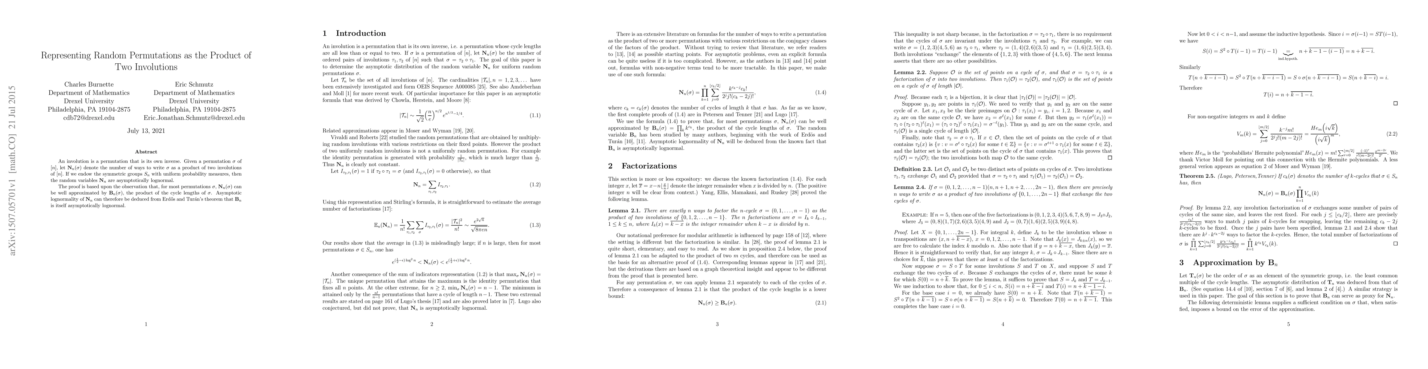 This paper investigates how random permutations can be expressed as the product of two involutions, showing that the number of such representations, denoted ${\mathbf N}_{n}$, is asymptotically lognormal. The proof leverages the relationship between ${\mathbf N}_{n}$ and ${\mathbf B}_{n}$, the product of the cycle lengths of a permutation, which is also asymptotically lognormal according to Erdős and Turán's theorem.