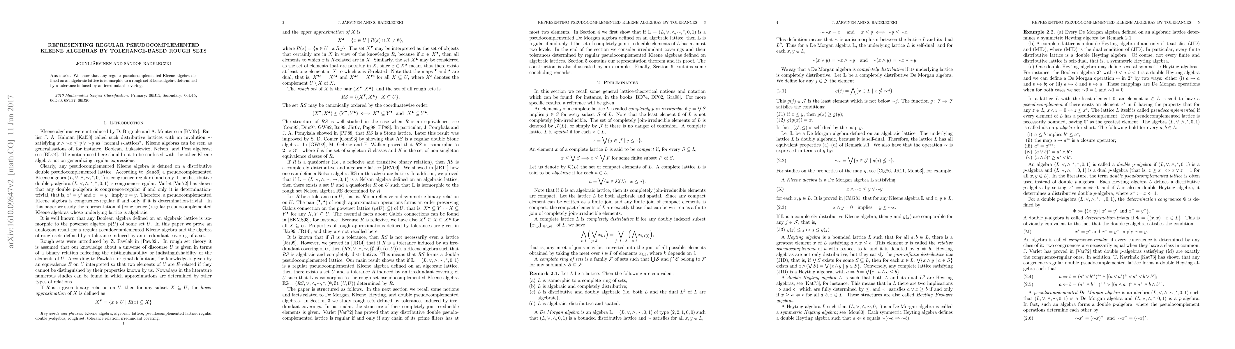 We show that any regular pseudocomplemented Kleene algebra defined on an algebraic lattice is isomorphic to a rough set Kleene algebra determined by a tolerance induced by an irredundant covering.