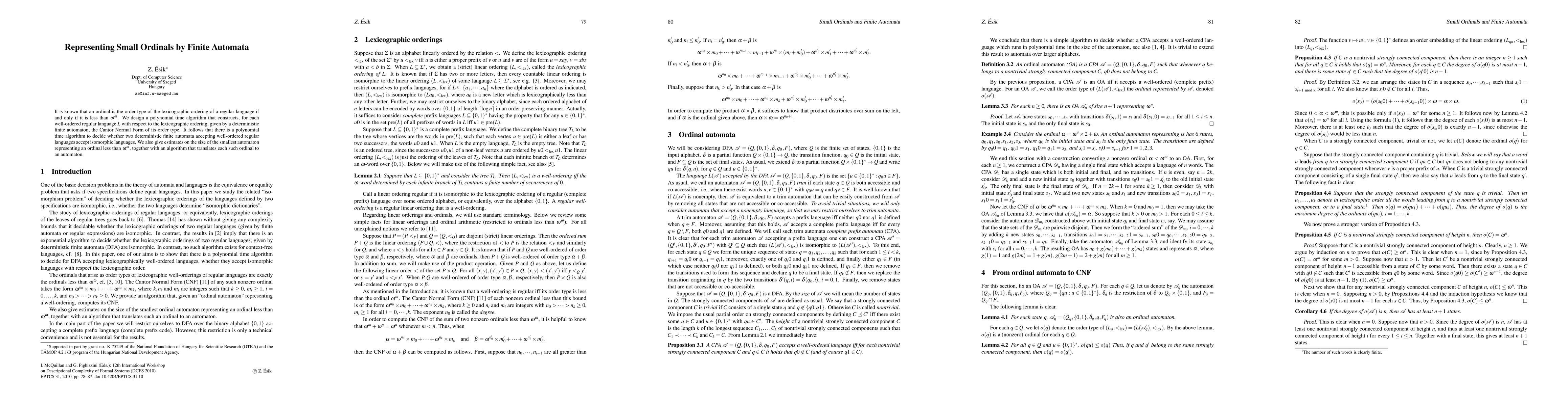 It is known that an ordinal is the order type of the lexicographic ordering of a regular language if and only if it is less than omega^omega. We design a polynomial time algorithm that constructs, for each well-ordered regular language L with respect to the lexicographic ordering, given by a deterministic finite automaton, the Cantor Normal Form of its order type. It follows that there is a polynomial time algorithm to decide whether two deterministic finite automata accepting well-ordered regular languages accept isomorphic languages. We also give estimates on the size of the smallest automaton representing an ordinal less than omega^omega, together with an algorithm that translates each such ordinal to an automaton.