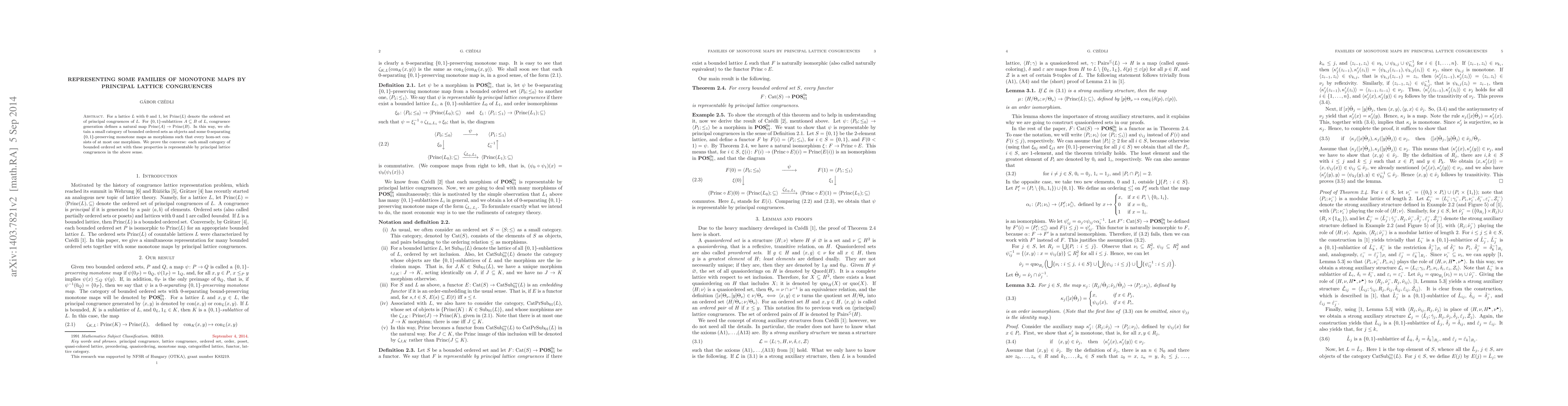 This paper establishes a representation of certain families of monotone maps between {0,1}-sublattices of a lattice L by principal lattice congruences, showing that any small category with bounded ordered sets and specific 0-separating, {0,1}-preserving monotone maps can be represented by principal lattice congruences.