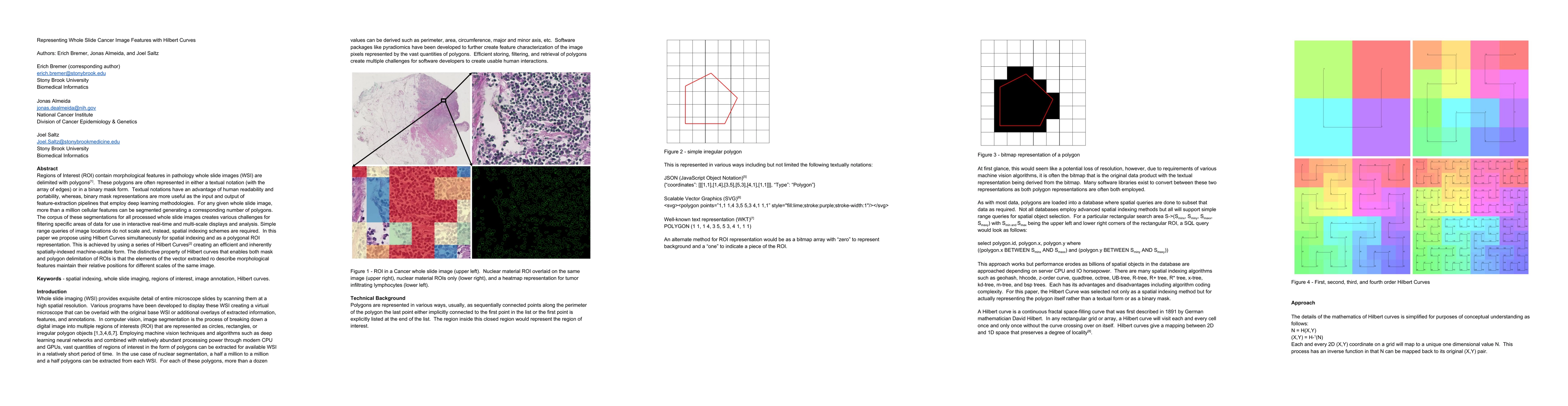 Regions of Interest (ROI) contain morphological features in pathology whole slide images (WSI) are delimited with polygons[1]. These polygons are often represented in either a textual notation (with the array of edges) or in a binary mask form. Textual notations have an advantage of human readability and portability, whereas, binary mask representations are more useful as the input and output of feature-extraction pipelines that employ deep learning methodologies. For any given whole slide image, more than a million cellular features can be segmented generating a corresponding number of polygons. The corpus of these segmentations for all processed whole slide images creates various challenges for filtering specific areas of data for use in interactive real-time and multi-scale displays and analysis. Simple range queries of image locations do not scale and, instead, spatial indexing schemes are required. In this paper we propose using Hilbert Curves simultaneously for spatial indexing and as a polygonal ROI representation. This is achieved by using a series of Hilbert Curves[2] creating an efficient and inherently spatially-indexed machine-usable form. The distinctive property of Hilbert curves that enables both mask and polygon delimitation of ROIs is that the elements of the vector extracted ro describe morphological features maintain their relative positions for different scales of the same image.