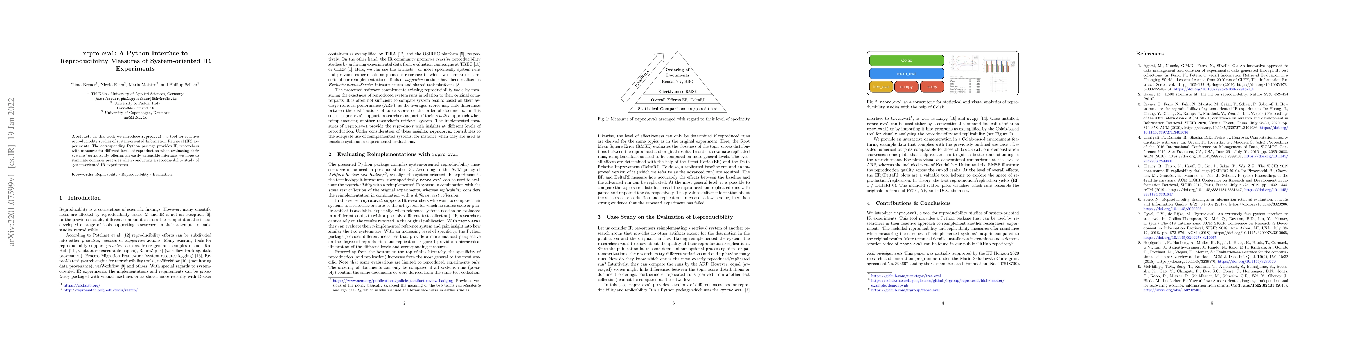 Summary: The paper introduces repro_eval, a Python tool for assessing reproducibility in system-oriented information retrieval experiments, providing researchers with measures for different reproduction levels and aiming to promote standardized reproducibility practices.