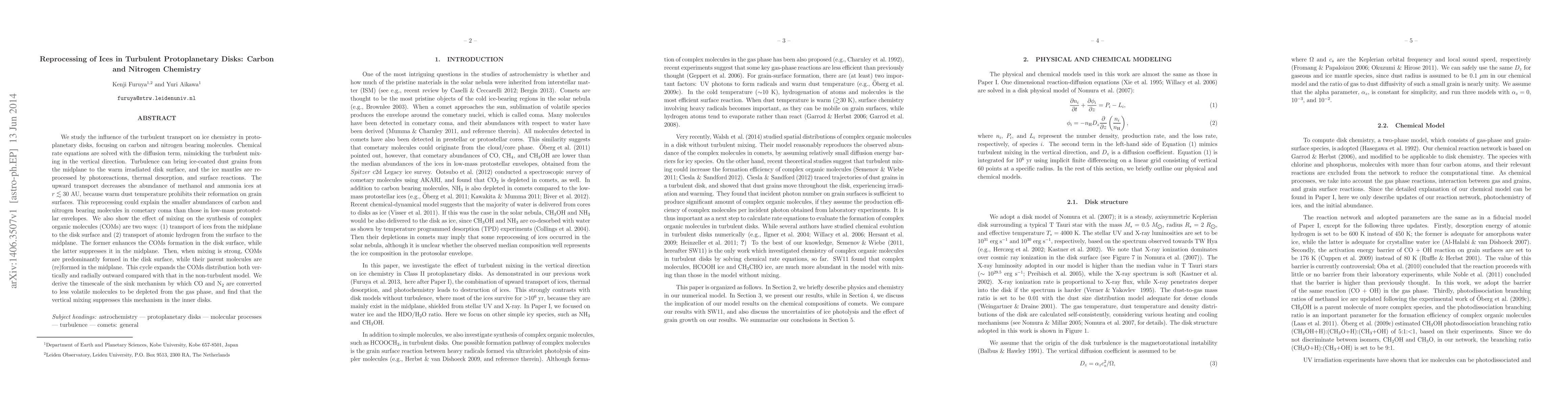 We study the influence of the turbulent transport on ice chemistry in protoplanetary disks, focusing on carbon and nitrogen bearing molecules. Chemical rate equations are solved with the diffusion term, mimicking the turbulent mixing in the vertical direction. Turbulence can bring ice-coated dust grains from the midplane to the warm irradiated disk surface, and the ice mantles are reprocessed by photoreactions, thermal desorption, and surface reactions. The upward transport decreases the abundance of methanol and ammonia ices at r < 30 AU, because warm dust temperature prohibits their reformation on grain surfaces. This reprocessing could explain the smaller abundances of carbon and nitrogen bearing molecules in cometary coma than those in low-mass protostellar envelopes. We also show the effect of mixing on the synthesis of complex organic molecules (COMs) are two ways: (1) transport of ices from the midplane to the disk surface and (2) transport of atomic hydrogen from the surface to the midplane. The former enhances the COMs formation in the disk surface, while the latter suppresses it in the midplane. Then, when mixing is strong, COMs are predominantly formed in the disk surface, while their parent molecules are (re)formed in the midplane. This cycle expands the COMs distribution both vertically and radially outward compared with that in the non-turbulent model. We derive the timescale of the sink mechanism by which CO and N2 are converted to less volatile molecules to be depleted from the gas phase, and find that the vertical mixing suppresses this mechanism in the inner disks.
