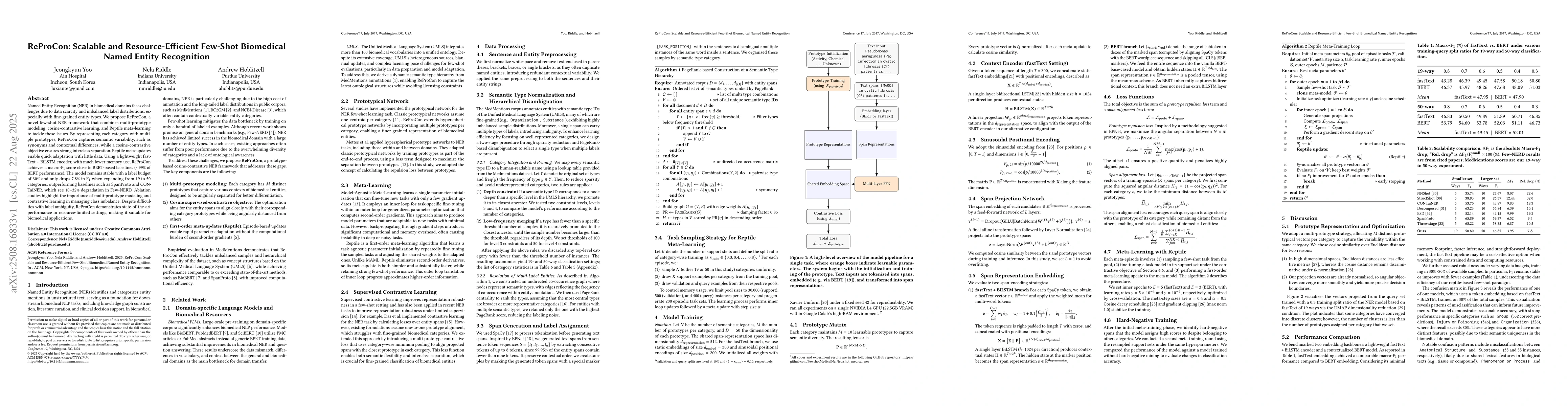 Named Entity Recognition (NER) in biomedical domains faces challenges due to data scarcity and imbalanced label distributions, especially with fine-grained entity types. We propose ReProCon, a novel few-shot NER framework that combines multi-prototype modeling, cosine-contrastive learning, and Reptile meta-learning to tackle these issues. By representing each category with multiple prototypes, ReProCon captures semantic variability, such as synonyms and contextual differences, while a cosine-contrastive objective ensures strong interclass separation. Reptile meta-updates enable quick adaptation with little data. Using a lightweight fastText + BiLSTM encoder with much lower memory usage, ReProCon achieves a macro-$F_1$ score close to BERT-based baselines (around 99 percent of BERT performance). The model remains stable with a label budget of 30 percent and only drops 7.8 percent in $F_1$ when expanding from 19 to 50 categories, outperforming baselines such as SpanProto and CONTaiNER, which see 10 to 32 percent degradation in Few-NERD. Ablation studies highlight the importance of multi-prototype modeling and contrastive learning in managing class imbalance. Despite difficulties with label ambiguity, ReProCon demonstrates state-of-the-art performance in resource-limited settings, making it suitable for biomedical applications.