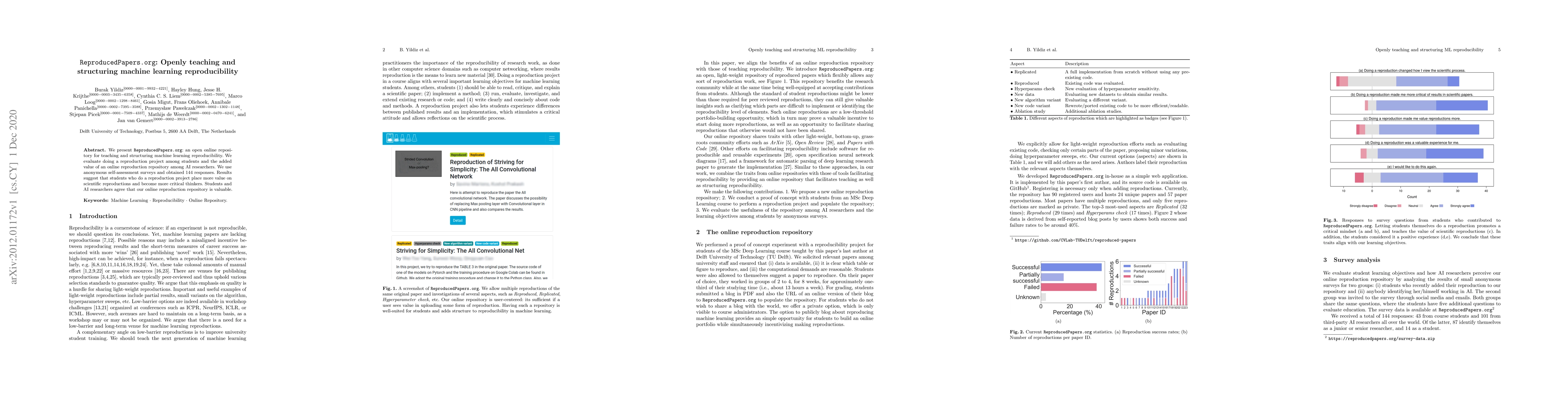 We present ReproducedPapers.org: an open online repository for teaching and structuring machine learning reproducibility. We evaluate doing a reproduction project among students and the added value of an online reproduction repository among AI researchers. We use anonymous self-assessment surveys and obtained 144 responses. Results suggest that students who do a reproduction project place more value on scientific reproductions and become more critical thinkers. Students and AI researchers agree that our online reproduction repository is valuable.