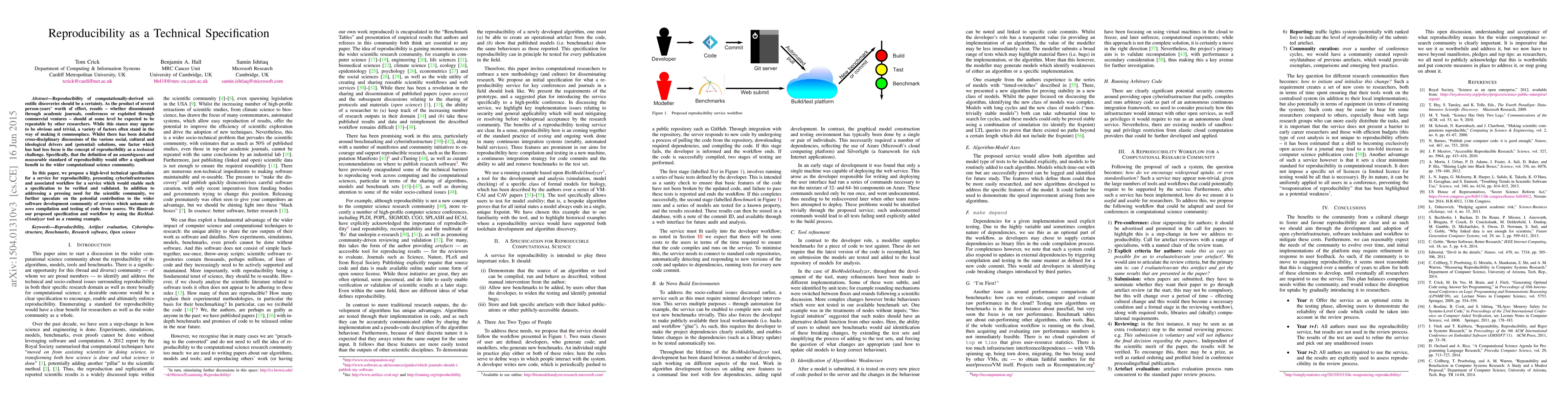 The paper presents a technical specification and workflow for a reproducibility service, including cyberinfrastructure, which can automate de novo compilation and testing of code from source.