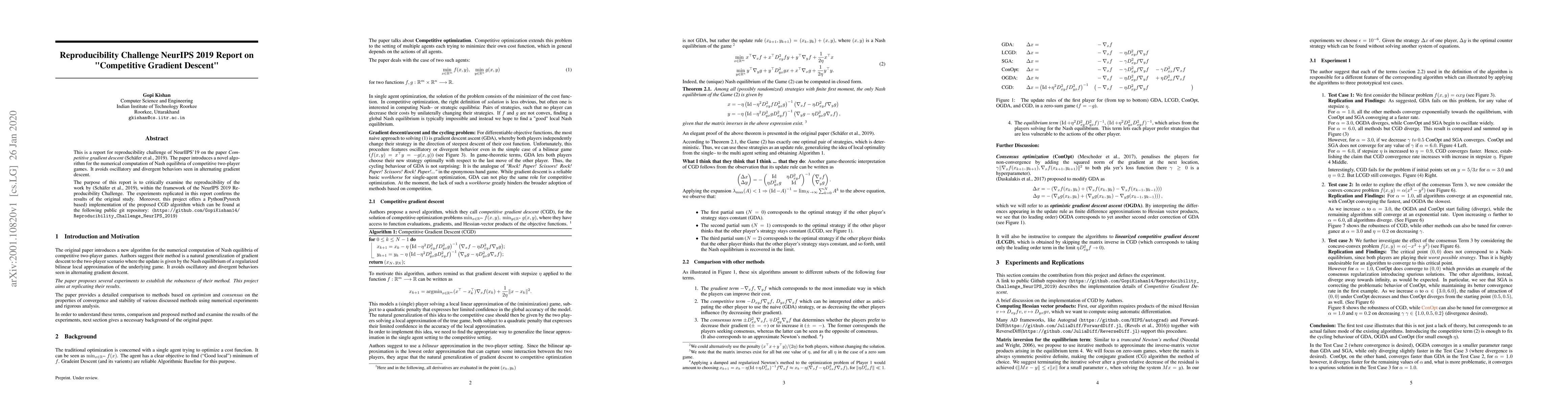 This report evaluates the reproducibility of the Competitive Gradient Descent algorithm presented in Schafer et al. (2019) within the NeurIPS 2019 Reproducibility Challenge, confirming the original study's results and providing a PyTorch-based implementation for the algorithm. The project's code is available on GitHub.