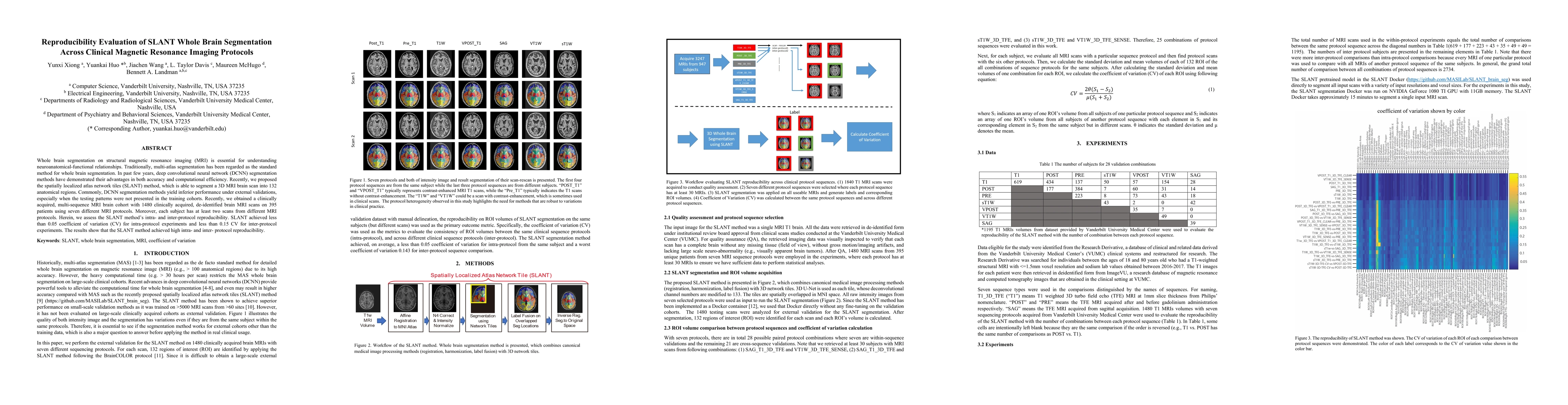 The study evaluates the reproducibility of the SLANT method for whole brain segmentation across seven clinical MRI protocols using a cohort of 1480 de-identified brain MRI scans from 395 patients. The SLANT method, combining medical image processing with 3D network tiles, segments MRI scans into 132 anatomical regions. The reproducibility is assessed by calculating the coefficient of variation (CV) between same and different protocol sequences.