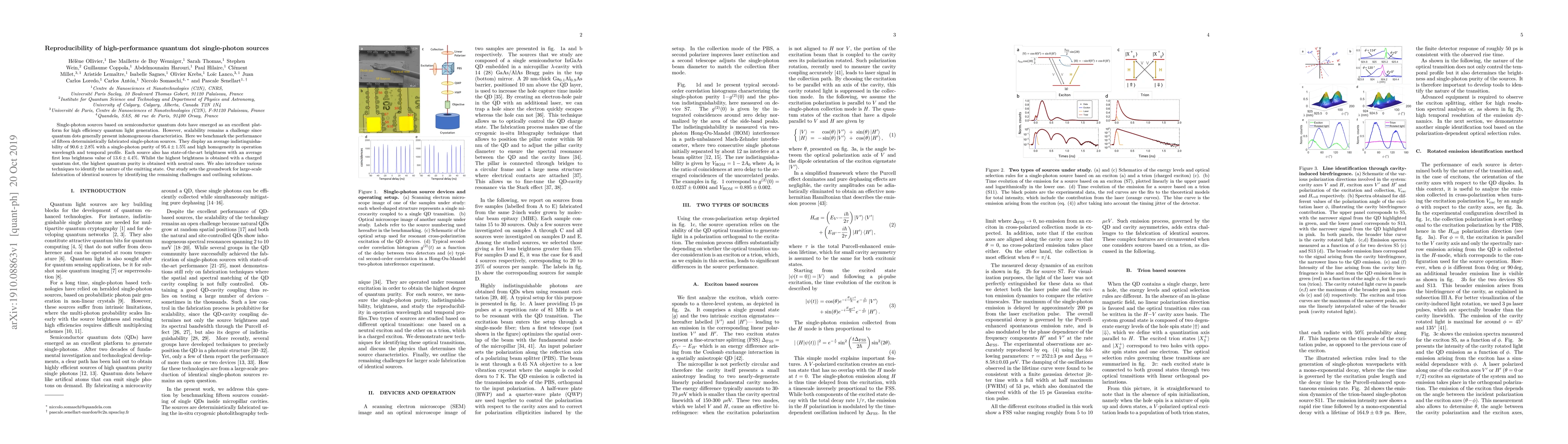 Single-photon sources based on semiconductor quantum dots have emerged as an excellent platform for high efficiency quantum light generation. However, scalability remains a challenge since quantum dots generally present inhomogeneous characteristics. Here we benchmark the performance of fifteen deterministically fabricated single-photon sources. They display an average indistinguishability of 90.6 +/- 2.8 % with a single-photon purity of 95.4 +/- 1.5 % and high homogeneity in operation wavelength and temporal profile. Each source also has state-of-the-art brightness with an average first lens brightness value of 13.6 +/- 4.4 %. Whilst the highest brightness is obtained with a charged quantum dot, the highest quantum purity is obtained with neutral ones. We also introduce various techniques to identify the nature of the emitting state. Our study sets the groundwork for large-scale fabrication of identical sources by identifying the remaining challenges and outlining solutions.
