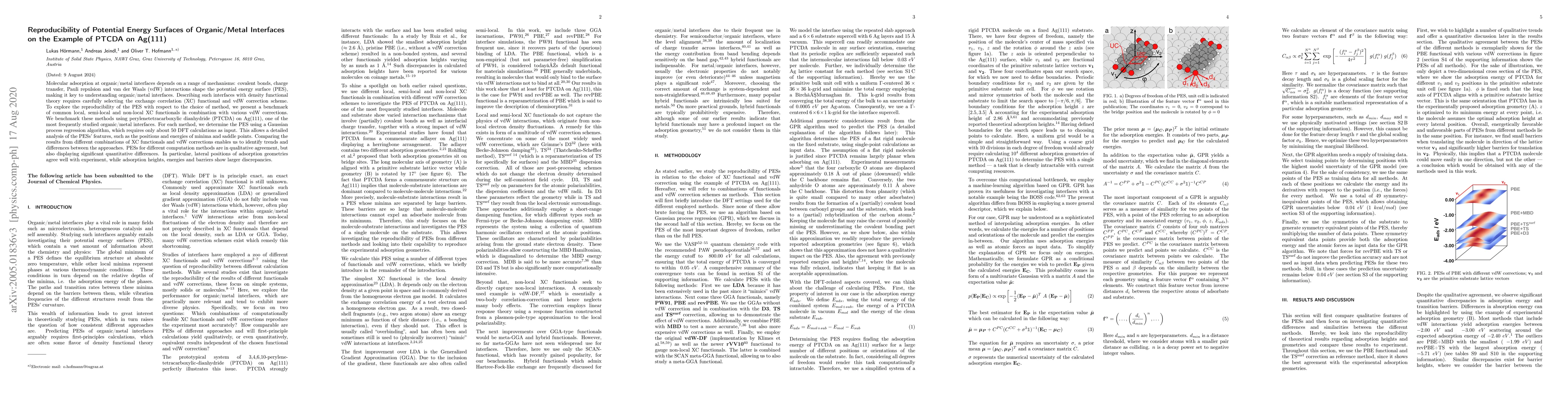 This study benchmarks various density functional theory methods to assess the reproducibility of potential energy surfaces for the PTCDA/Ag(111) organic/metal interface, revealing qualitative agreement but significant quantitative differences in adsorption heights, energies, and barriers. The analysis highlights the impact of different exchange correlation functionals and van der Waals corrections on the computed potential energy surfaces.