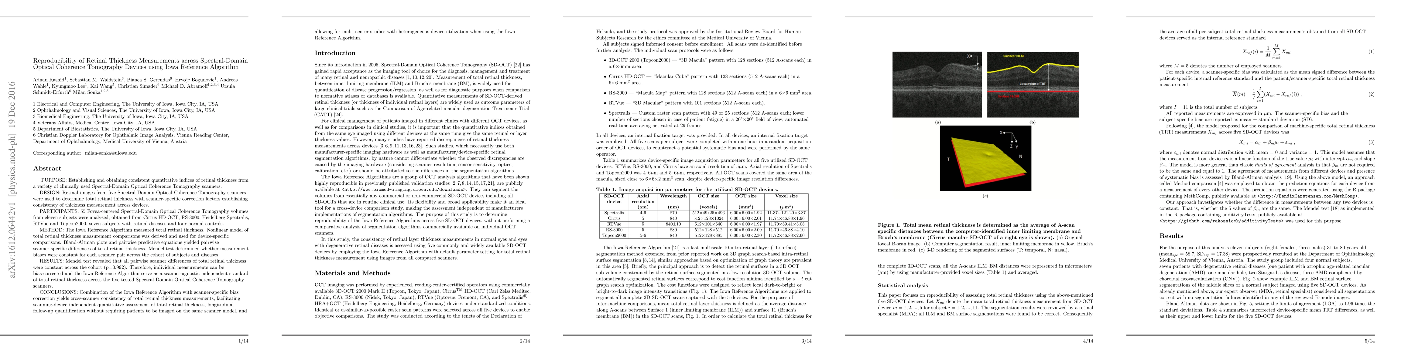This study establishes consistent retinal thickness measurements across five Spectral-Domain Optical Coherence Tomography devices using the Iowa Reference Algorithm and scanner-specific correction factors. The Mendel test confirmed constant measurement biases, enabling unbiased, cross-device comparisons and multi-center study feasibility.