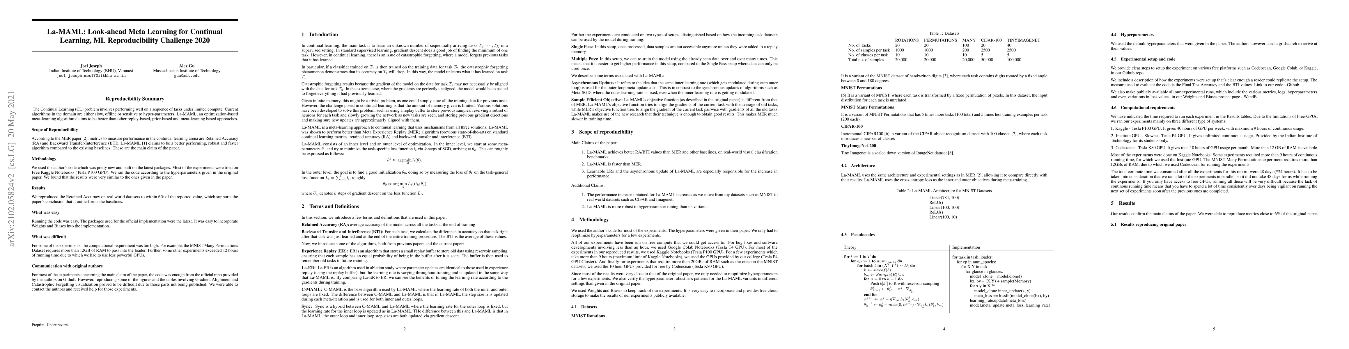 The Continual Learning (CL) problem involves performing well on a sequence of tasks under limited compute. Current algorithms in the domain are either slow, offline or sensitive to hyper-parameters. La-MAML, an optimization-based meta-learning algorithm claims to be better than other replay-based, prior-based and meta-learning based approaches. According to the MER paper [1], metrics to measure performance in the continual learning arena are Retained Accuracy (RA) and Backward Transfer-Interference (BTI). La-MAML claims to perform better in these values when compared to the SOTA in the domain. This is the main claim of the paper, which we shall be verifying in this report.
