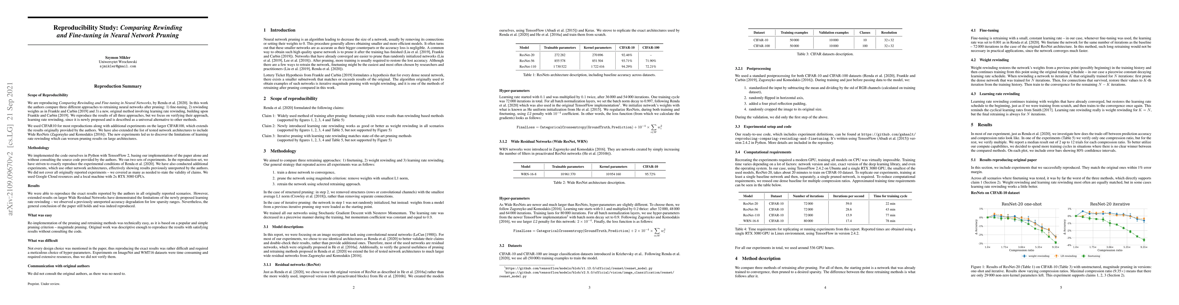 Scope of reproducibility: We are reproducing Comparing Rewinding and Fine-tuning in Neural Networks from arXiv:2003.02389. In this work the authors compare three different approaches to retraining neural networks after pruning: 1) fine-tuning, 2) rewinding weights as in arXiv:1803.03635 and 3) a new, original method involving learning rate rewinding, building upon Lottery Ticket Hypothesis. We reproduce the results of all three approaches, but we focus on verifying their approach, learning rate rewinding, since it is newly proposed and is described as a universal alternative to other methods. We used CIFAR10 for most reproductions along with additional experiments on the larger CIFAR100, which extends the results originally provided by the authors. We have also extended the list of tested network architectures to include Wide ResNets. The new experiments led us to discover the limitations of learning rate rewinding which can worsen pruning results on large architectures. Results: We were able to reproduce the exact results reported by the authors in all originally reported scenarios. However, extended results on larger Wide Residual Networks have demonstrated the limitations of the newly proposed learning rate rewinding -- we observed a previously unreported accuracy degradation for low sparsity ranges. Nevertheless, the general conclusion of the paper still holds and was indeed reproduced.