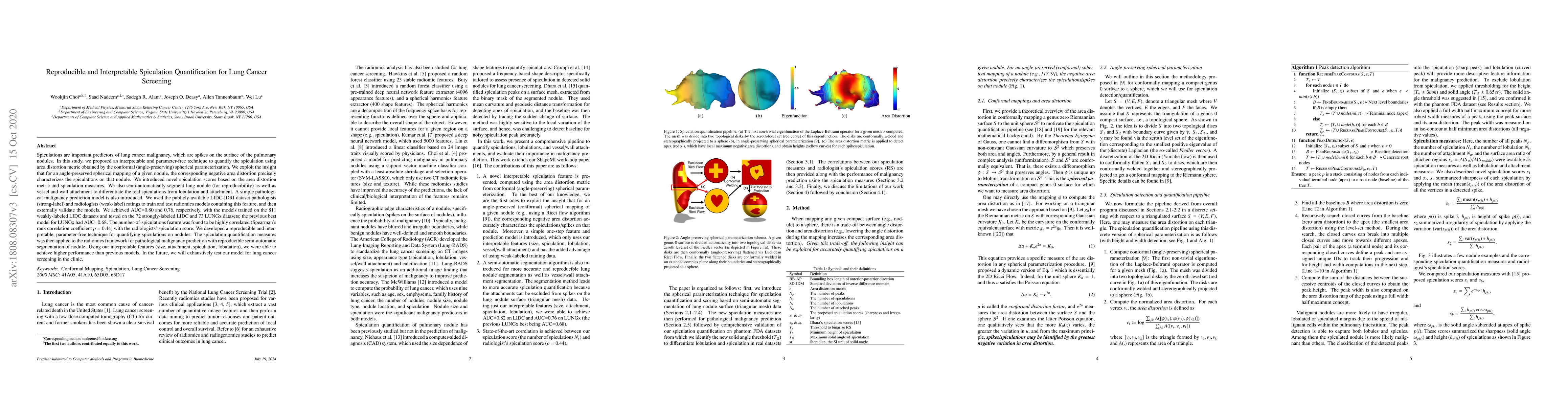 Spiculations are important predictors of lung cancer malignancy, which are spikes on the surface of the pulmonary nodules. In this study, we proposed an interpretable and parameter-free technique to quantify the spiculation using area distortion metric obtained by the conformal (angle-preserving) spherical parameterization. We exploit the insight that for an angle-preserved spherical mapping of a given nodule, the corresponding negative area distortion precisely characterizes the spiculations on that nodule. We introduced novel spiculation scores based on the area distortion metric and spiculation measures. We also semi-automatically segment lung nodule (for reproducibility) as well as vessel and wall attachment to differentiate the real spiculations from lobulation and attachment. A simple pathological malignancy prediction model is also introduced. We used the publicly-available LIDC-IDRI dataset pathologists (strong-label) and radiologists (weak-label) ratings to train and test radiomics models containing this feature, and then externally validate the models. We achieved AUC$=$0.80 and 0.76, respectively, with the models trained on the 811 weakly-labeled LIDC datasets and tested on the 72 strongly-labeled LIDC and 73 LUNGx datasets; the previous best model for LUNGx had AUC$=$0.68. The number-of-spiculations feature was found to be highly correlated (Spearman's rank correlation coefficient $\rho = 0.44$) with the radiologists' spiculation score. We developed a reproducible and interpretable, parameter-free technique for quantifying spiculations on nodules. The spiculation quantification measures was then applied to the radiomics framework for pathological malignancy prediction with reproducible semi-automatic segmentation of nodule. Using our interpretable features (size, attachment, spiculation, lobulation), we were able to achieve higher performance than previous models.