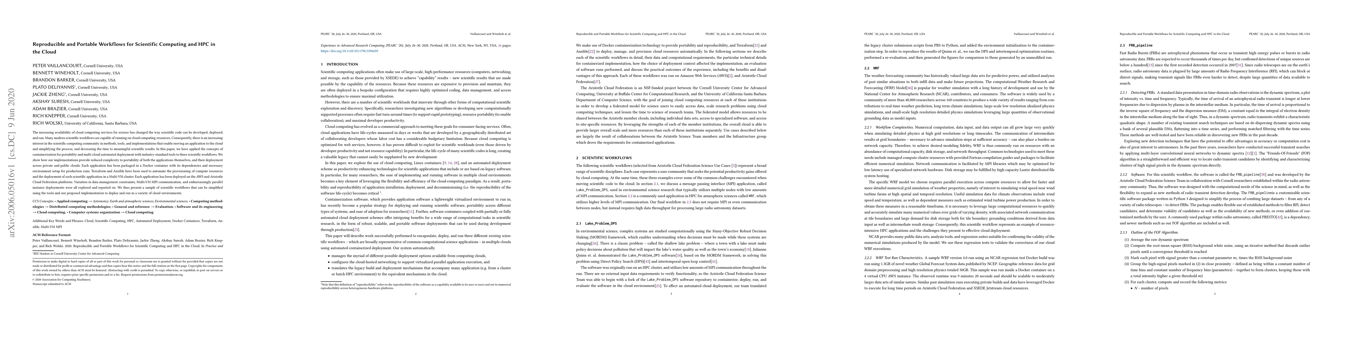 This paper explores the use of containerization and multi-cloud deployment tools to simplify scientific workflows for cloud computing. The authors demonstrate the reduced complexity in moving applications to the cloud by packaging them in Docker containers and automating deployment with Terraform and Ansible, showing successful execution on AWS and Aristotle Cloud Federation platforms.