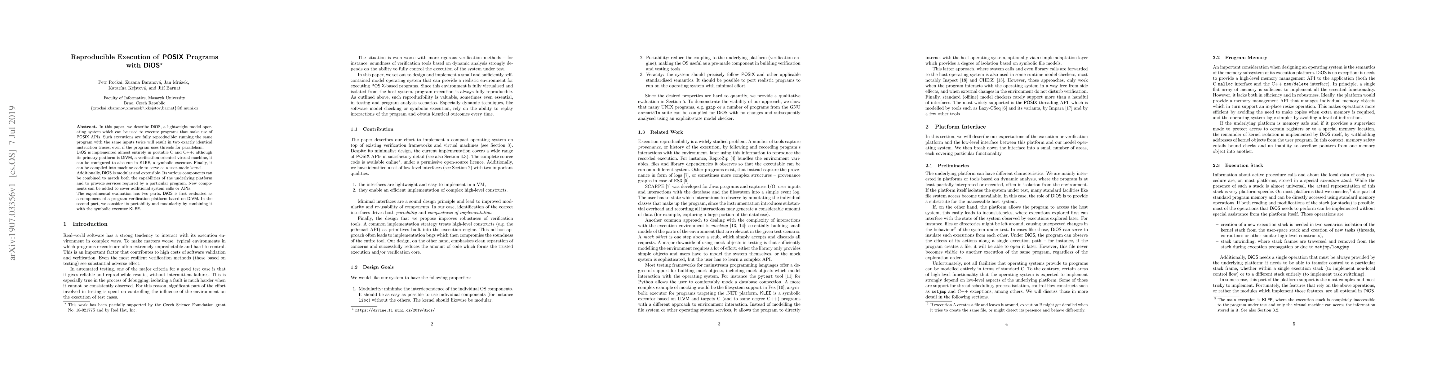 In this paper, we describe DiOS, a lightweight model operating system which can be used to execute programs that make use of POSIX APIs. Such executions are fully reproducible: running the same program with the same inputs twice will result in two exactly identical instruction traces, even if the program uses threads for parallelism. DiOS is implemented almost entirely in portable C and C++: although its primary platform is DiVM, a verification-oriented virtual machine, it can be configured to also run in KLEE, a symbolic executor. Finally, it can be compiled into machine code to serve as a user-mode kernel. Additionally, DiOS is modular and extensible. Its various components can be combined to match both the capabilities of the underlying platform and to provide services required by a particular program. New components can be added to cover additional system calls or APIs. The experimental evaluation has two parts. DiOS is first evaluated as a component of a program verification platform based on DiVM. In the second part, we consider its portability and modularity by combining it with the symbolic executor KLEE.