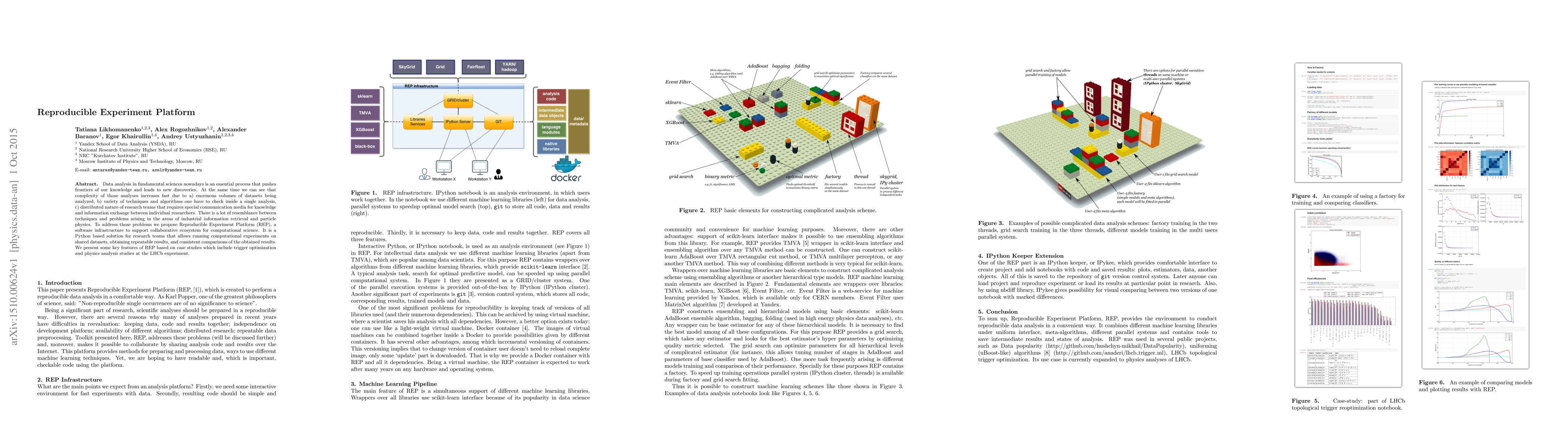 The Reproducible Experiment Platform (REP) is a Python-based software infrastructure designed to facilitate collaborative computational science by enabling shared dataset analysis, repeatable results, and consistent comparisons. It addresses the complexities of modern data analysis in fundamental sciences, including large datasets, diverse techniques, and distributed research teams.
