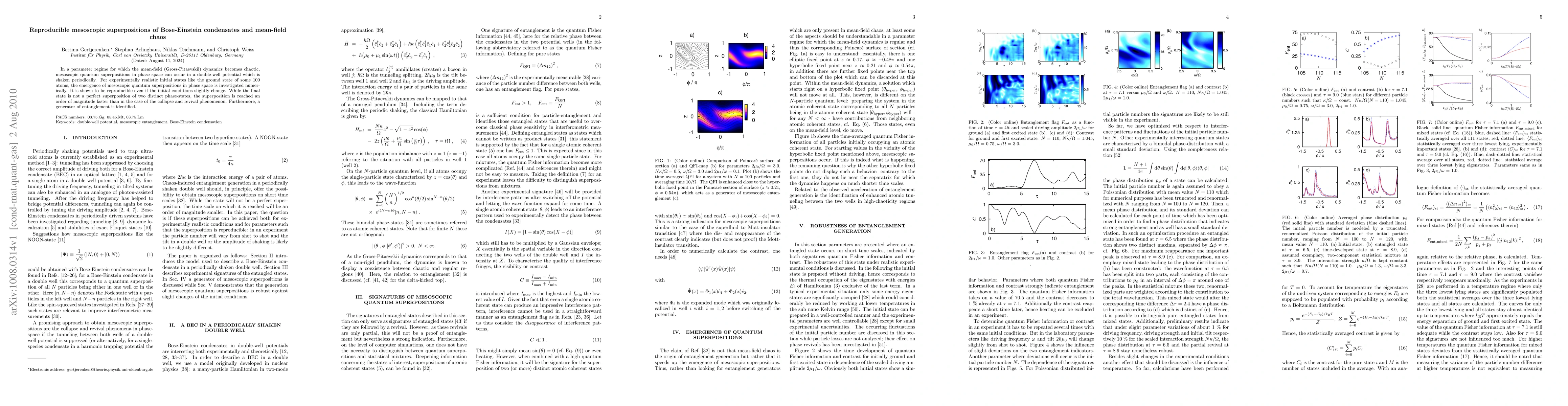 In a parameter regime for which the mean-field (Gross-Pitaevskii) dynamics becomes chaotic, mesoscopic quantum superpositions in phase space can occur in a double-well potential which is shaken periodically. For experimentally realistic initial states like the ground state of some 100 atoms, the emergence of mesoscopic quantum superpositions in phase space is investigated numerically. It is shown to be reproducible even if the initial conditions slightly change. While the final state is not a perfect superposition of two distinct phase-states, the superposition is reached an order of magnitude faster than in the case of the collapse and revival phenomenon. Furthermore, a generator of entanglement is identified.