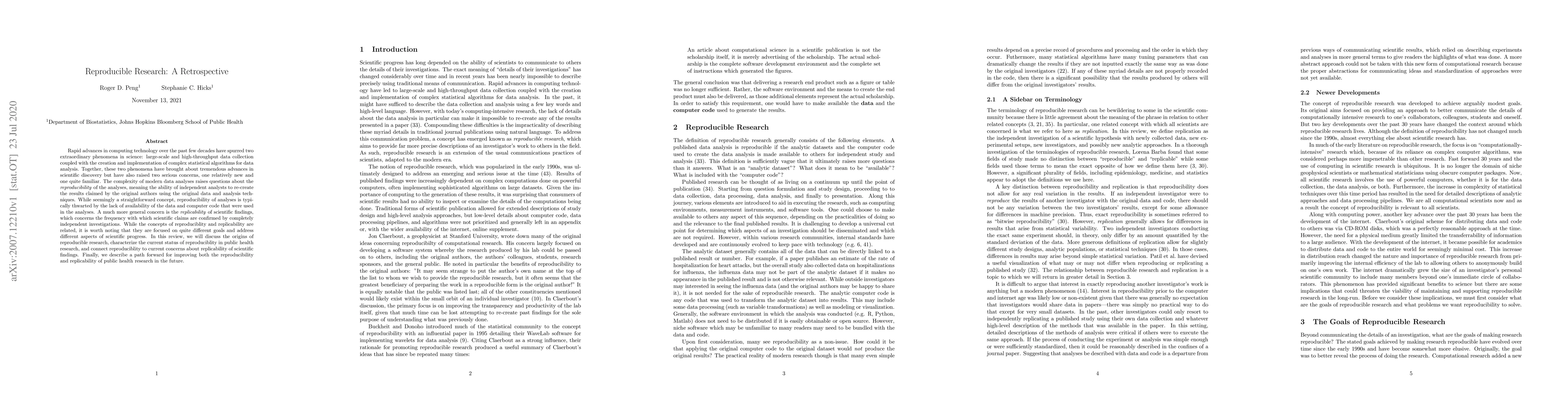 Rapid advances in computing technology over the past few decades have spurred two extraordinary phenomena in science: large-scale and high-throughput data collection coupled with the creation and implementation of complex statistical algorithms for data analysis. Together, these two phenomena have brought about tremendous advances in scientific discovery but have also raised two serious concerns, one relatively new and one quite familiar. The complexity of modern data analyses raises questions about the reproducibility of the analyses, meaning the ability of independent analysts to re-create the results claimed by the original authors using the original data and analysis techniques. While seemingly a straightforward concept, reproducibility of analyses is typically thwarted by the lack of availability of the data and computer code that were used in the analyses. A much more general concern is the replicability of scientific findings, which concerns the frequency with which scientific claims are confirmed by completely independent investigations. While the concepts of reproduciblity and replicability are related, it is worth noting that they are focused on quite different goals and address different aspects of scientific progress. In this review, we will discuss the origins of reproducible research, characterize the current status of reproduciblity in public health research, and connect reproduciblity to current concerns about replicability of scientific findings. Finally, we describe a path forward for improving both the reproducibility and replicability of public health research in the future.