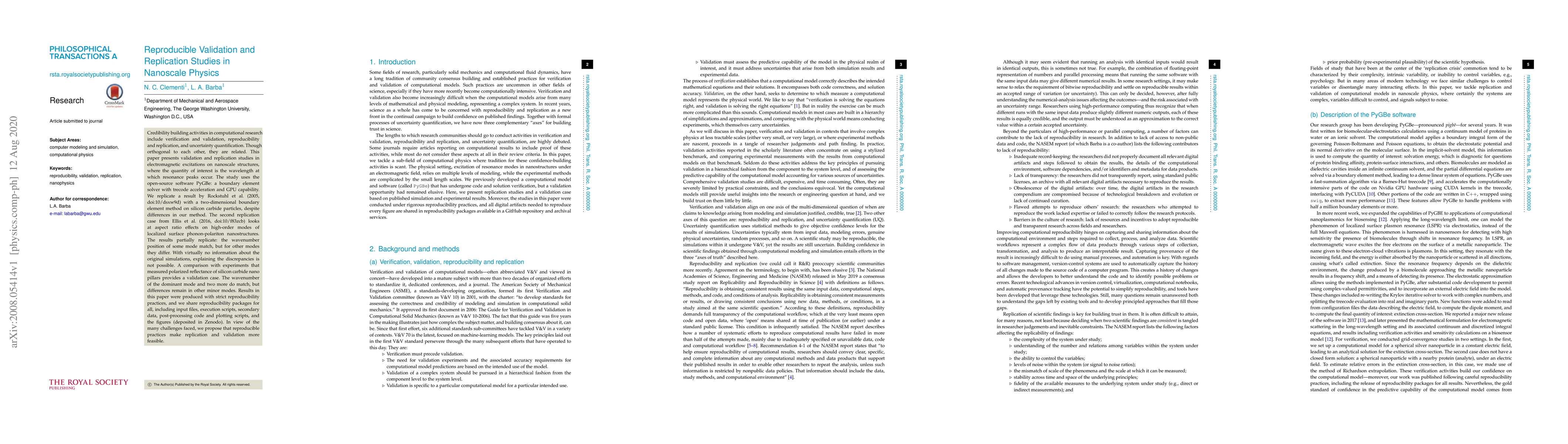 Credibility building activities in computational research include verification and validation, reproducibility and replication, and uncertainty quantification. Though orthogonal to each other, they are related. This paper presents validation and replication studies in electromagnetic excitations on nanoscale structures, where the quantity of interest is the wavelength at which resonance peaks occur. The study uses the open-source software PyGBe: a boundary element solver with trecode acceleration and GPU capability. We replicate a result by Rockstuhl et al. (2005, doi:10/dsxw9d) with a two-dimensional boundary element method on silicon carbide particles, despite differences in our method. The second replication case from Ellis et al. (2016, doi:10/f83zcb) looks at aspect ratio effects on high-order modes of localized surface phonon-polariton nanostructures. The results partially replicate: the wavenumber position of some mode match, but for other modes they differ. With virtually no information about the original simulations, explaining the discrepancies is not possible. A comparison with experiments that measured polarized reflectance of silicon carbide nano pillars provides a validation case. The wavenumber of the dominant mode and two more do match, but differences remain in other minor modes. Results in this paper were produced with strict reproducibility practices, and we share reproducibility packages for all, including input files, execution scripts, secondary data, post-processing code and plotting scripts, and the figures (deposited in Zenodo). In view of the many challenges faced, we propose that reproducible practices make replication and validation more feasible.