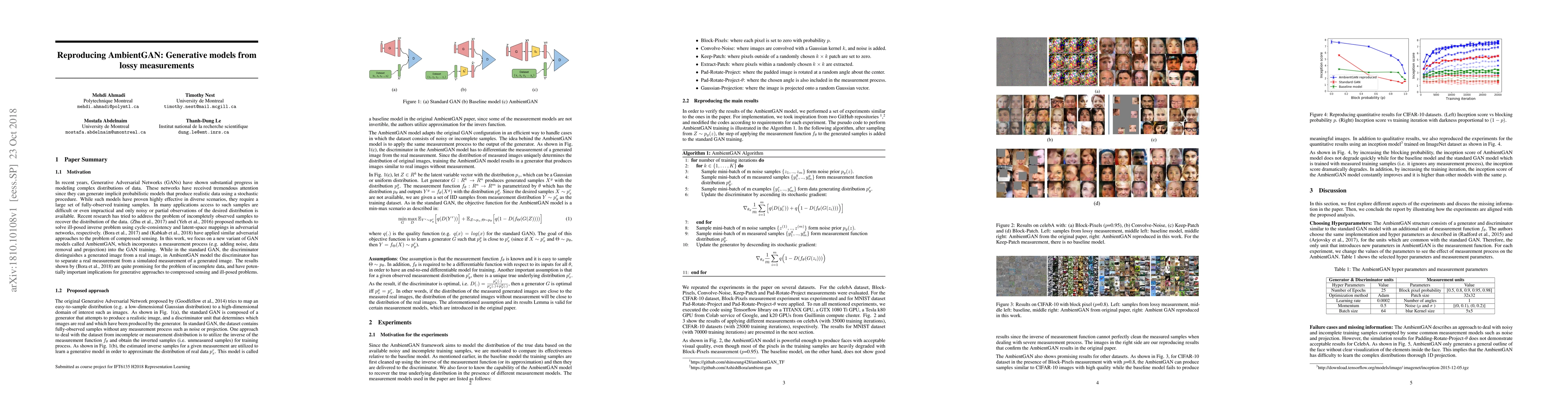 In recent years, Generative Adversarial Networks (GANs) have shown substantial progress in modeling complex distributions of data. These networks have received tremendous attention since they can generate implicit probabilistic models that produce realistic data using a stochastic procedure. While such models have proven highly effective in diverse scenarios, they require a large set of fully-observed training samples. In many applications access to such samples are difficult or even impractical and only noisy or partial observations of the desired distribution is available. Recent research has tried to address the problem of incompletely observed samples to recover the distribution of the data. \citep{zhu2017unpaired} and \citep{yeh2016semantic} proposed methods to solve ill-posed inverse problem using cycle-consistency and latent-space mappings in adversarial networks, respectively. \citep{bora2017compressed} and \citep{kabkab2018task} have applied similar adversarial approaches to the problem of compressed sensing. In this work, we focus on a new variant of GAN models called AmbientGAN, which incorporates a measurement process (e.g. adding noise, data removal and projection) into the GAN training. While in the standard GAN, the discriminator distinguishes a generated image from a real image, in AmbientGAN model the discriminator has to separate a real measurement from a simulated measurement of a generated image. The results shown by \citep{bora2018ambientgan} are quite promising for the problem of incomplete data, and have potentially important implications for generative approaches to compressed sensing and ill-posed problems.