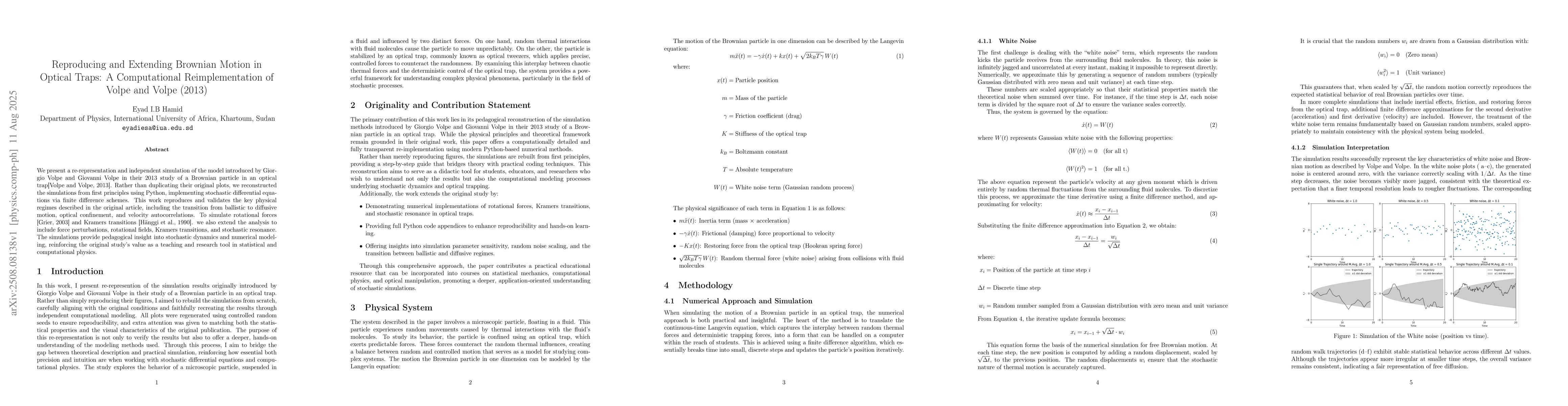 We present a re-representation and independent simulation of the model introduced by Giorgio Volpe and Giovanni Volpe in their 2013 study of a Brownian particle in an optical trap (Volpe and Volpe, 2013). Rather than duplicating their original plots, we reconstructed the simulations from first principles using Python, implementing stochastic differential equations via finite difference schemes. This work reproduces and validates the key physical regimes described in the original article, including the transition from ballistic to diffusive motion, optical confinement, and velocity autocorrelations. To simulate rotational forces (Grier, 2003) and Kramers transitions (Haenggi et al., 1990), we also extend the analysis to include force perturbations, rotational fields, Kramers transitions, and stochastic resonance. The simulations provide pedagogical insight into stochastic dynamics and numerical modeling, reinforcing the original study's value as a teaching and research tool in statistical and computational physics.