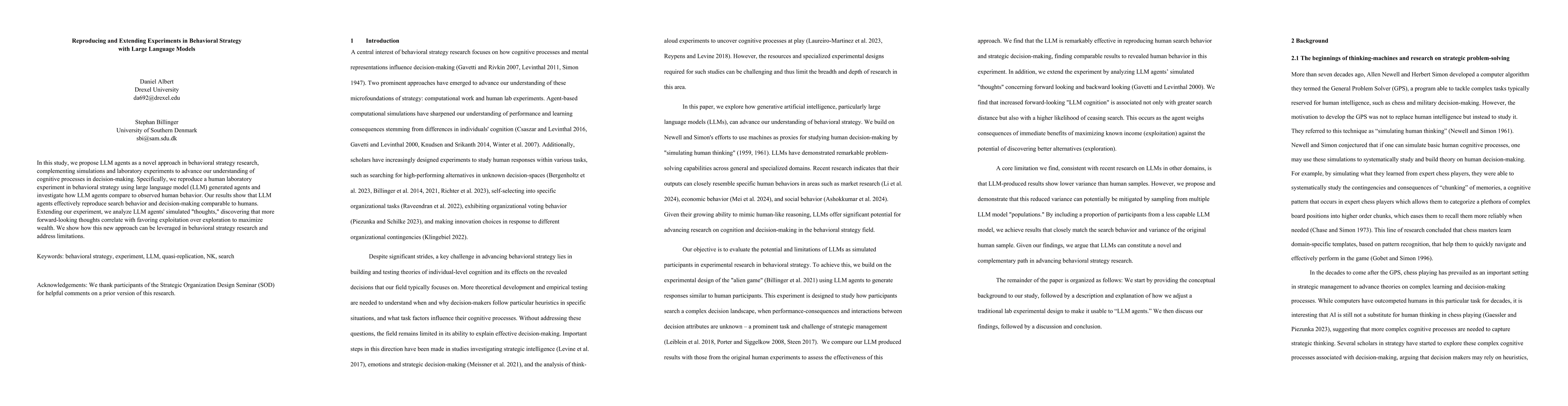 This study introduces large language model (LLM) agents to behavioral strategy research, effectively reproducing human decision-making processes and revealing that more forward-looking thoughts lead to exploitation over exploration. The approach complements traditional methods and highlights new avenues for cognitive process exploration.
