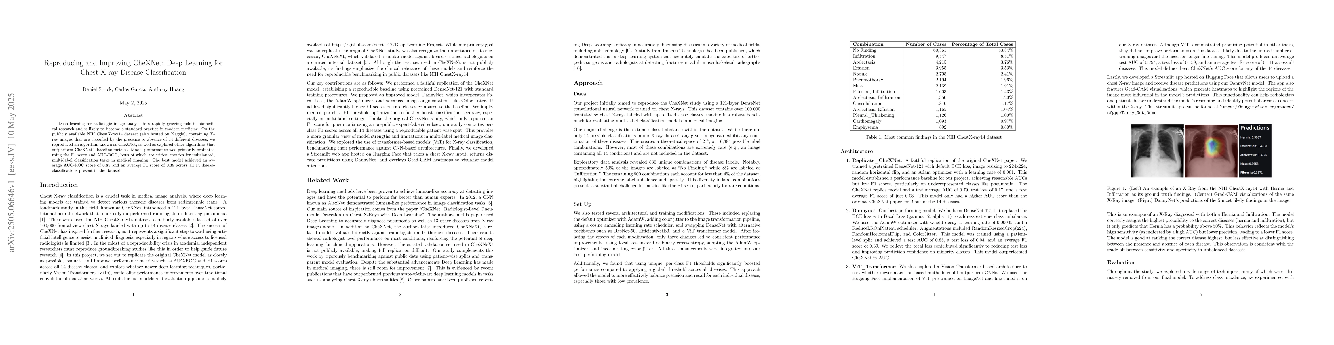 The research reproduced CheXNet on the NIH ChestX-ray14 dataset, which contains X-ray images classified into 14 diseases. Other algorithms were also explored to outperform CheXNet's baseline metrics.