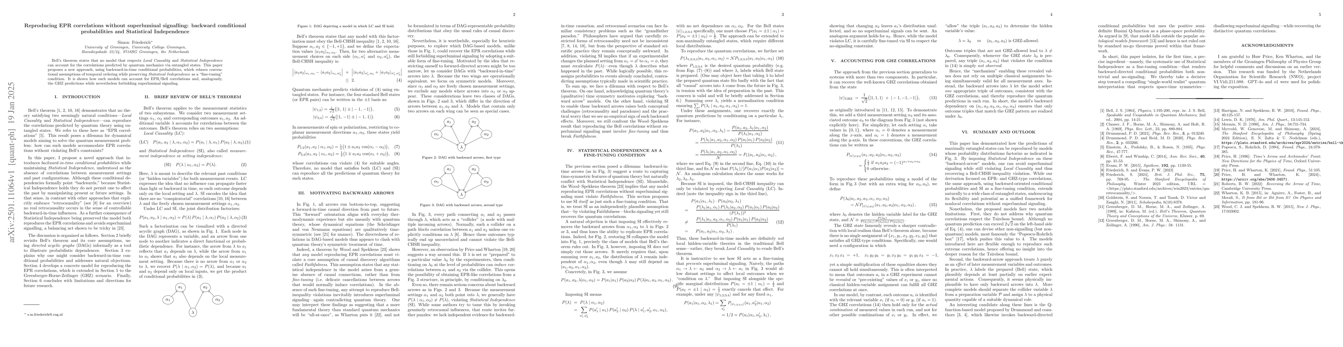 This paper introduces a novel approach using backward-in-time conditional probabilities to reproduce EPR/Bell correlations without violating local causality or superluminal signalling, while maintaining statistical independence as a fine-tuning condition. It demonstrates that such models can account for GHZ predictions without compromising causality.