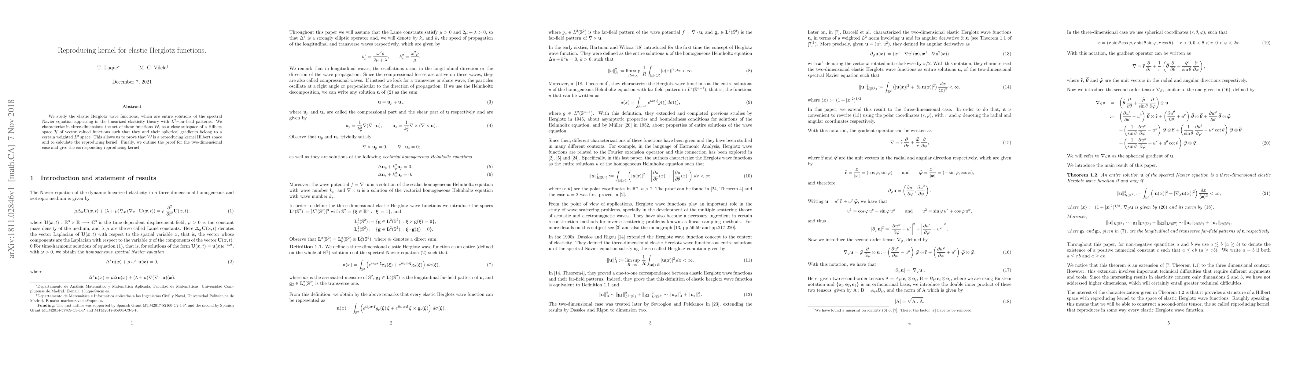 We study the elastic Herglotz wave functions, which are entire solutions of the spectral Navier equation appearing in the linearized elasticity theory with $L^2-$far-field patterns. We characterize in three-dimensions the set of these functions $\mathcal{W},$ as a close subspace of a Hilbert space $\mathcal{H}$ of vector valued functions such that they and their spherical gradients belong to a certain weighted $L^2$ space. This allows us to prove that $\mathcal{W}$ is a reproducing kernel Hilbert space and to calculate the reproducing kernel. Finally, we outline the proof for the two-dimensional case and give the corresponding reproducing kernel.