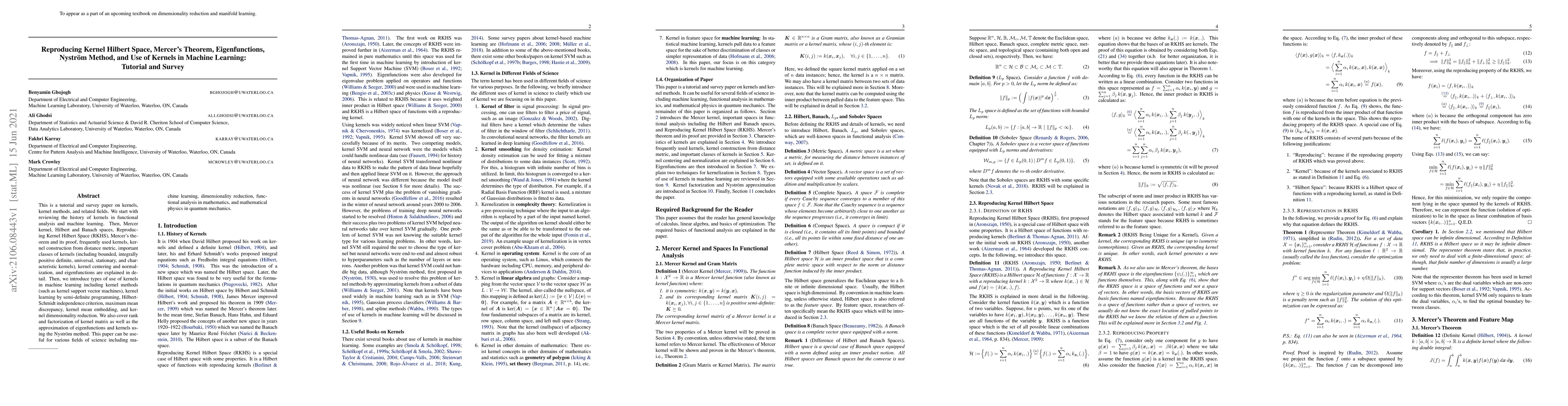 This paper provides a comprehensive tutorial and survey on kernel methods, covering the theoretical foundations of kernels, Mercer's theorem, and Reproducing Kernel Hilbert Space (RKHS). It also explores practical applications in machine learning, including kernel support vector machines and kernel dimensionality reduction techniques.