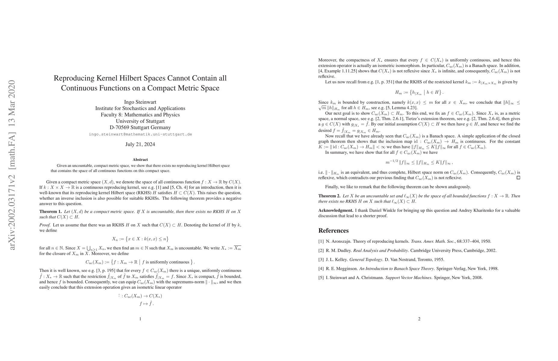 Given an uncountable, compact metric space, we show that there exists no reproducing kernel Hilbert space that contains the space of all continuous functions on this compact space.