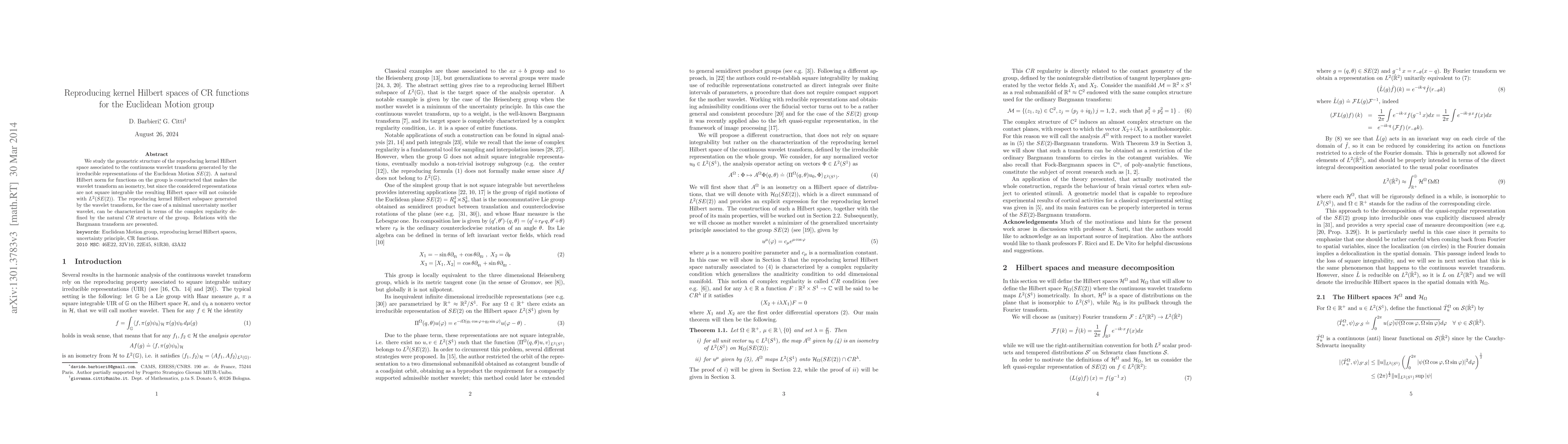 We study the geometric structure of the reproducing kernel Hilbert space associated to the continuous wavelet transform generated by the irreducible representations of the Euclidean Motion $SE(2)$. A natural Hilbert norm for functions on the group is constructed that makes the wavelet transform an isometry, but since the considered representations are not square integrable the resulting Hilbert space will not coincide with $L^2(SE(2))$. The reproducing kernel Hilbert subspace generated by the wavelet transform, for the case of a minimal uncertainty mother wavelet, can be characterized in terms of the complex regularity defined by the natural $CR$ structure of the group. Relations with the Bargmann transform are presented.