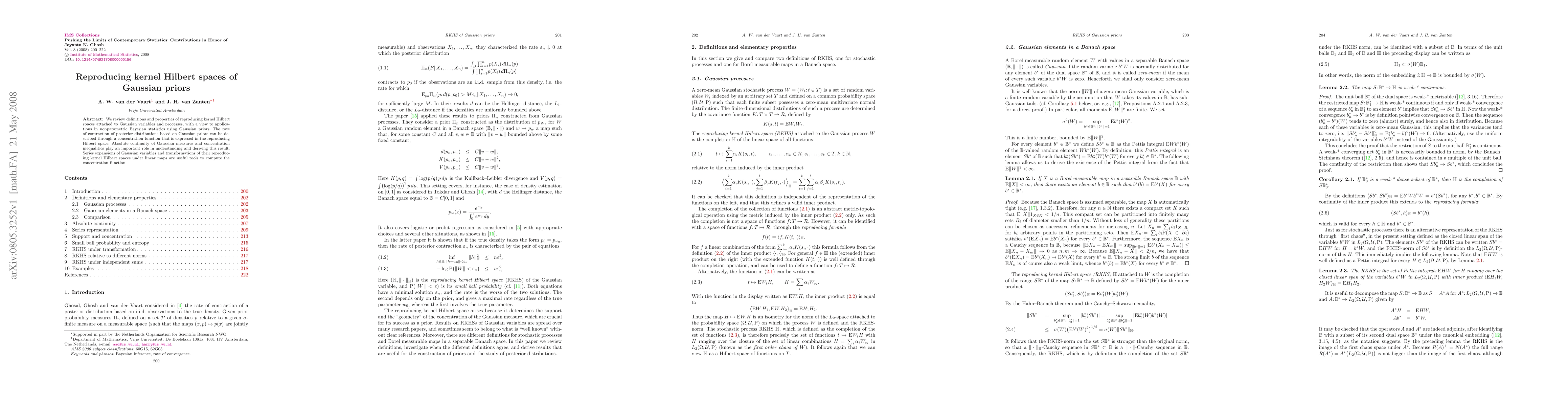 This paper reviews reproducing kernel Hilbert spaces (RKHS) associated with Gaussian priors, focusing on their application in nonparametric Bayesian statistics. It explores the rate of contraction of posterior distributions through a concentration function expressed in the RKHS, emphasizing the role of absolute continuity and concentration inequalities.